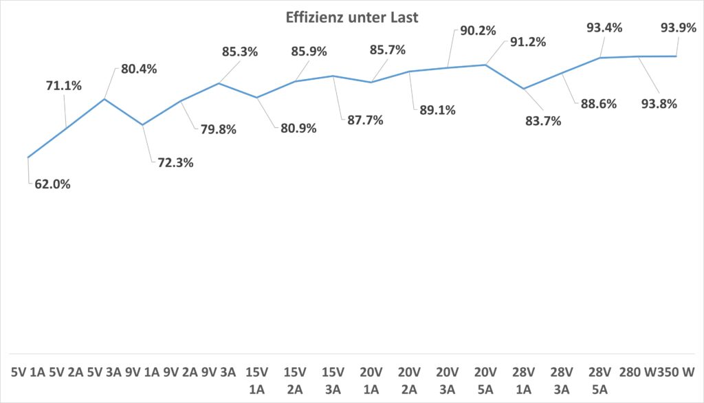 Die Effizienz von bis zu 93,9 % bei voller Auslastung ist beeindruckend! Das zeigt, dass hier qualitativ hochwertige GaN-Technologie zum Einsatz kommt.