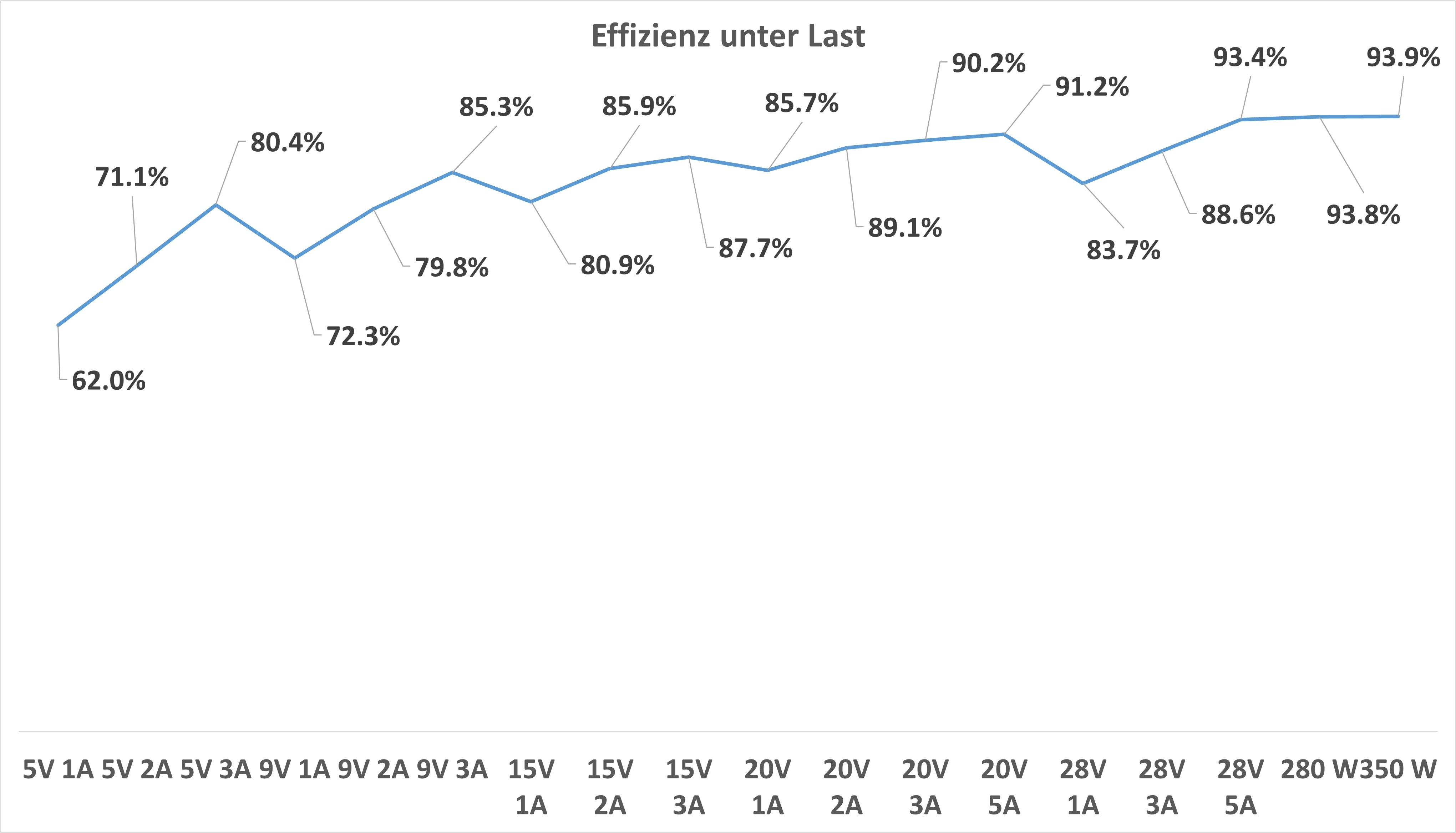 Diese schwankte im Test zwischen 62 % und 93,9 %. Die 62 % sind bei einer Last von 5 W. Normalerweise ist das eine recht schlechte minimale Effizienz, aber bei solch einem High-Power-Ladegerät ist dies nicht unerwartet.