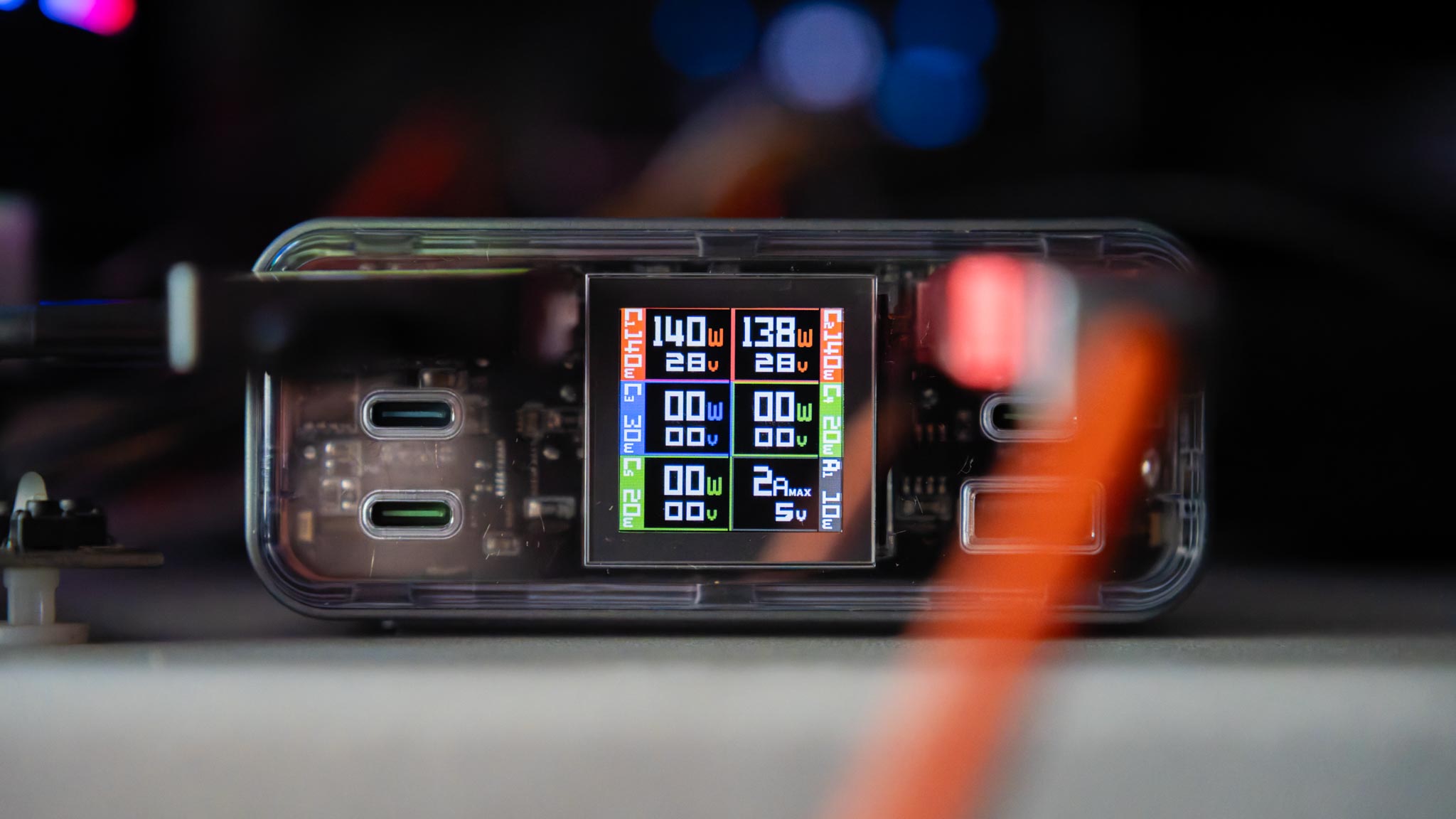 Das Farbdisplay auf der Front ist nicht nur ein nettes Gimmick, sondern richtig praktisch. Du siehst auf einen Blick, wie viel Leistung jeder Port zieht und welcher Modus aktiv ist. Die transparente Front verleiht dem Ladegerät zusätzlich einen technischen Look, der mir persönlich gut gefällt.