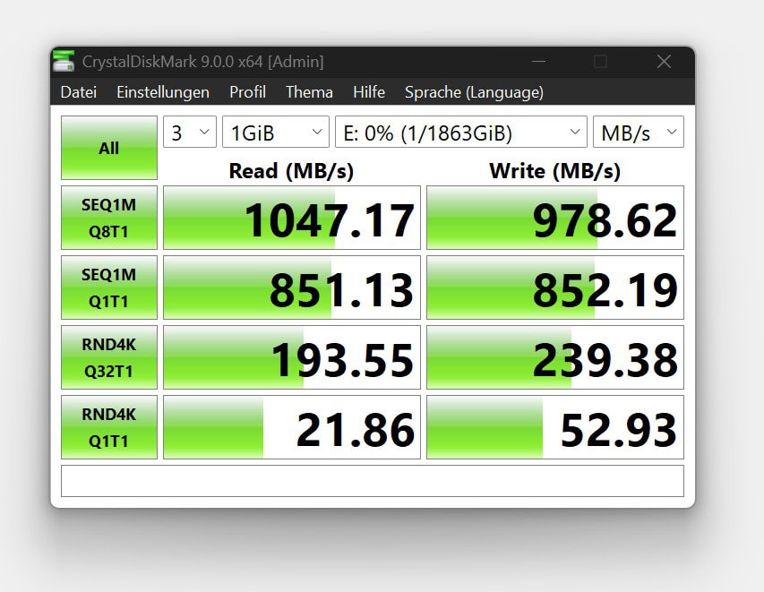 So konnte ich hier +- 1 GB/s erreichen. Bedenke aber, wenn du mehrere USB Geräte gleichzeitig ansprichst, dass sich dann die Geschwindigkeit reduzieren kann.
