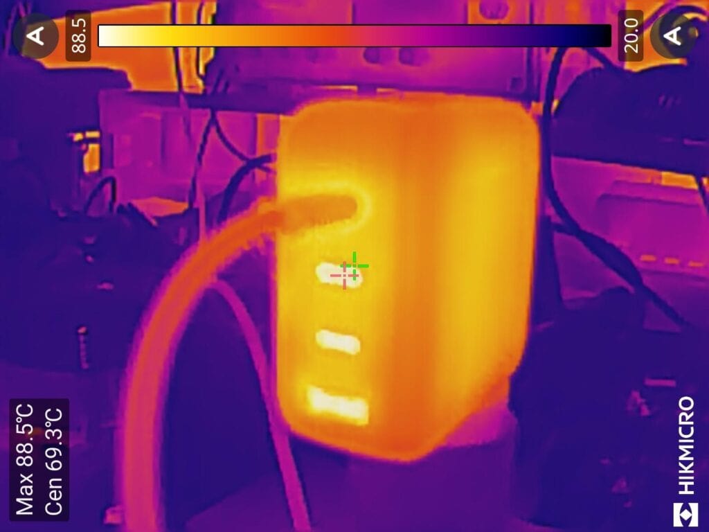 Es gab zwar schon eine deutliche Erwärmung und ich will nicht ausschließen, dass sich das Ladegerät bei 36 Grad im Sommer bei konstanter Last doch drosseln könnte, aber bei normaler Raumtemperatur gibt es keine Probleme.