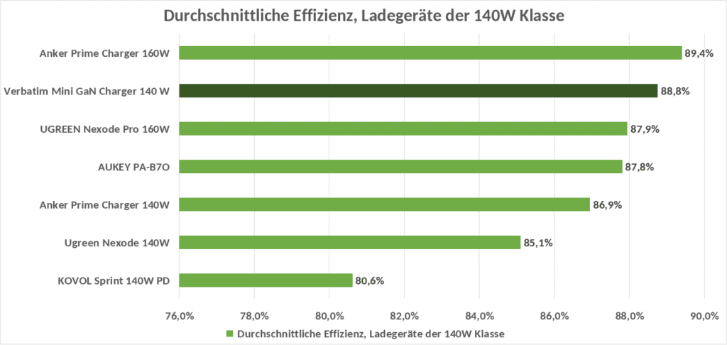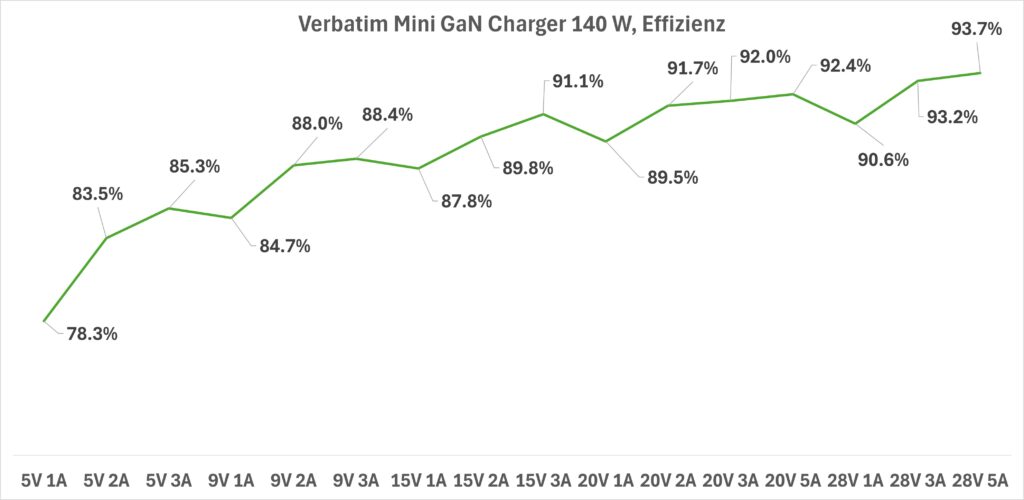 Erfreulicherweise zeigte der Verbatim Mini GaN Charger 140 W im Test eine sehr gute Effizienz!
