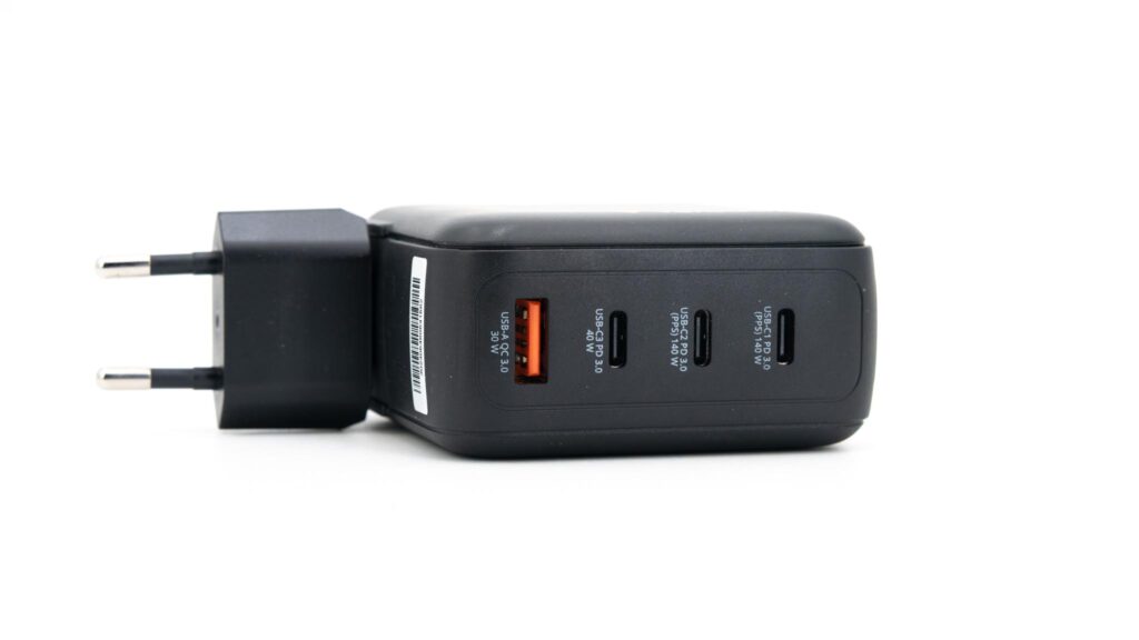 Neben den beiden 140-W-Ports haben wir auch noch einen 40-W-USB-C-Port und einen USB-A-Port.