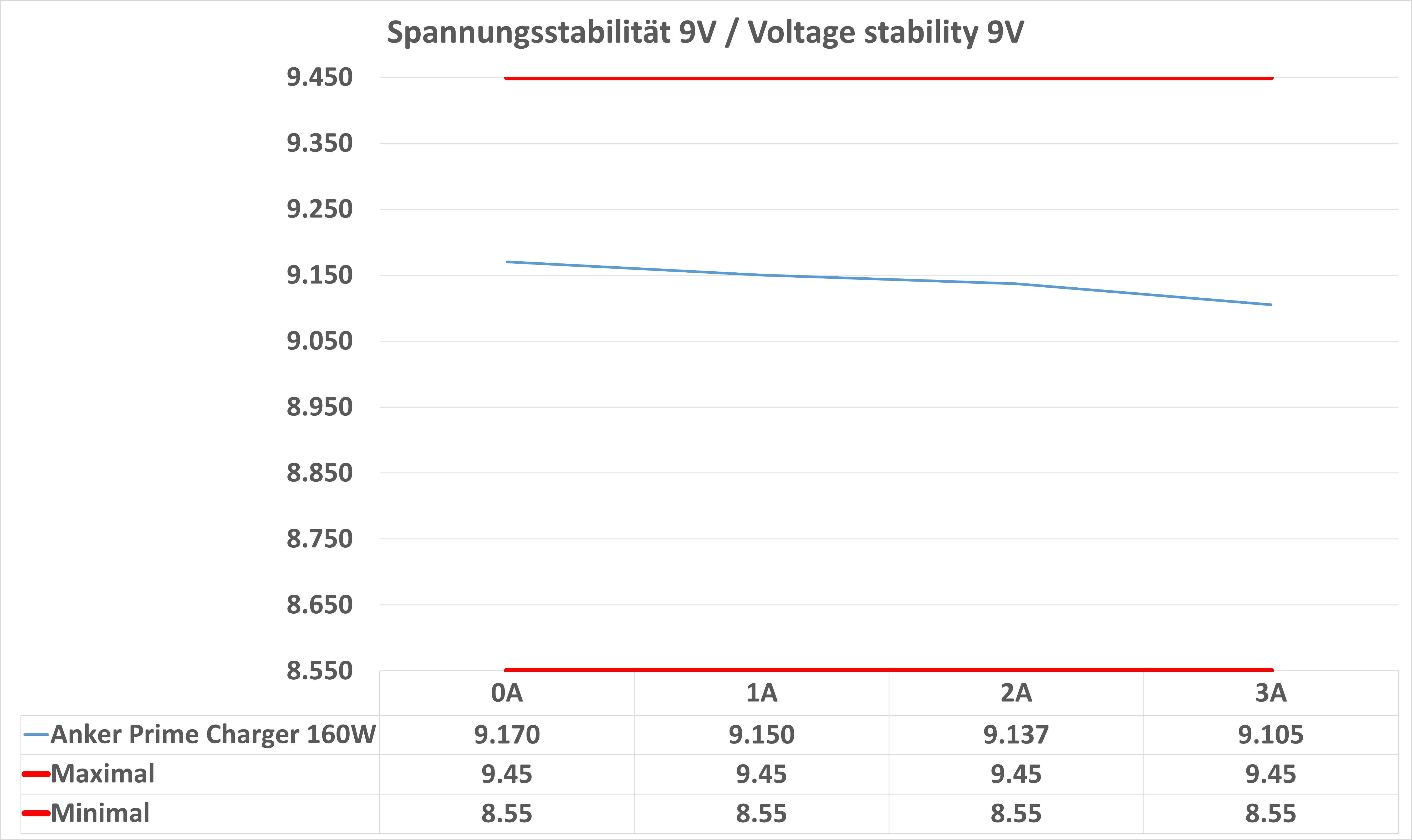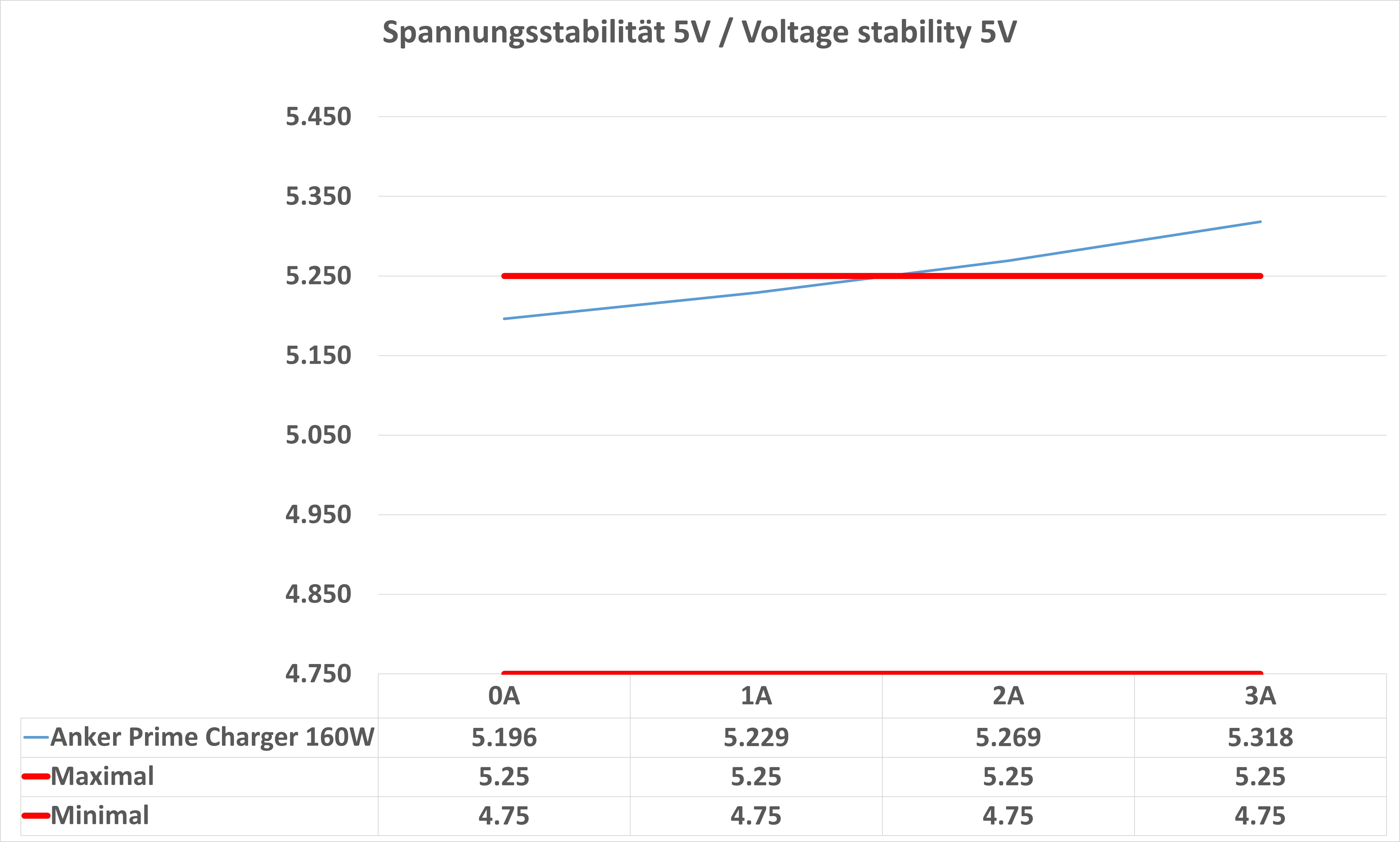 Bei der Spannung auf der 5-V-Stufe wird es etwas schwierig. So erreichte das Ladegerät bei mir im Test auf der 5-V-Stufe maximal 5,318 V. Laut des USB-Standards sind aber maximal 5 V +- 5 % erlaubt. Wobei dieser Wert anscheinend angehoben wurde, auf 5,5 V, laut Wikipedia.