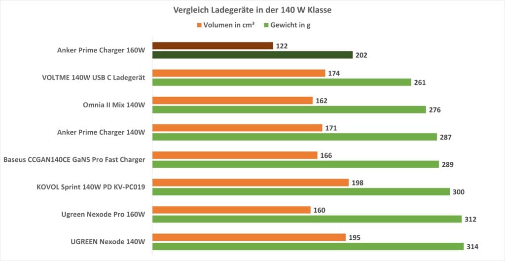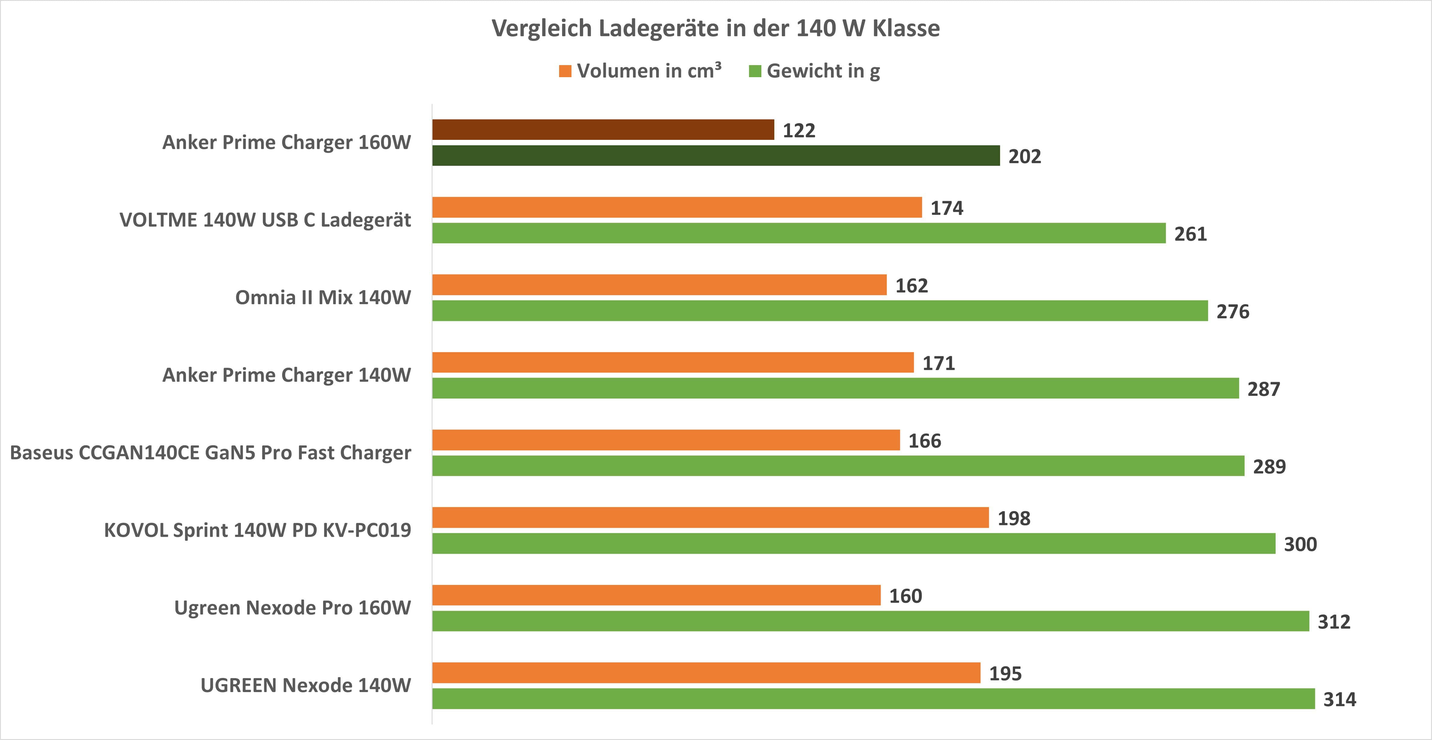 Dies sehen wir auch im Vergleich zu anderen 140/160 W Modellen, welche merkbar größer und schwerer sind.