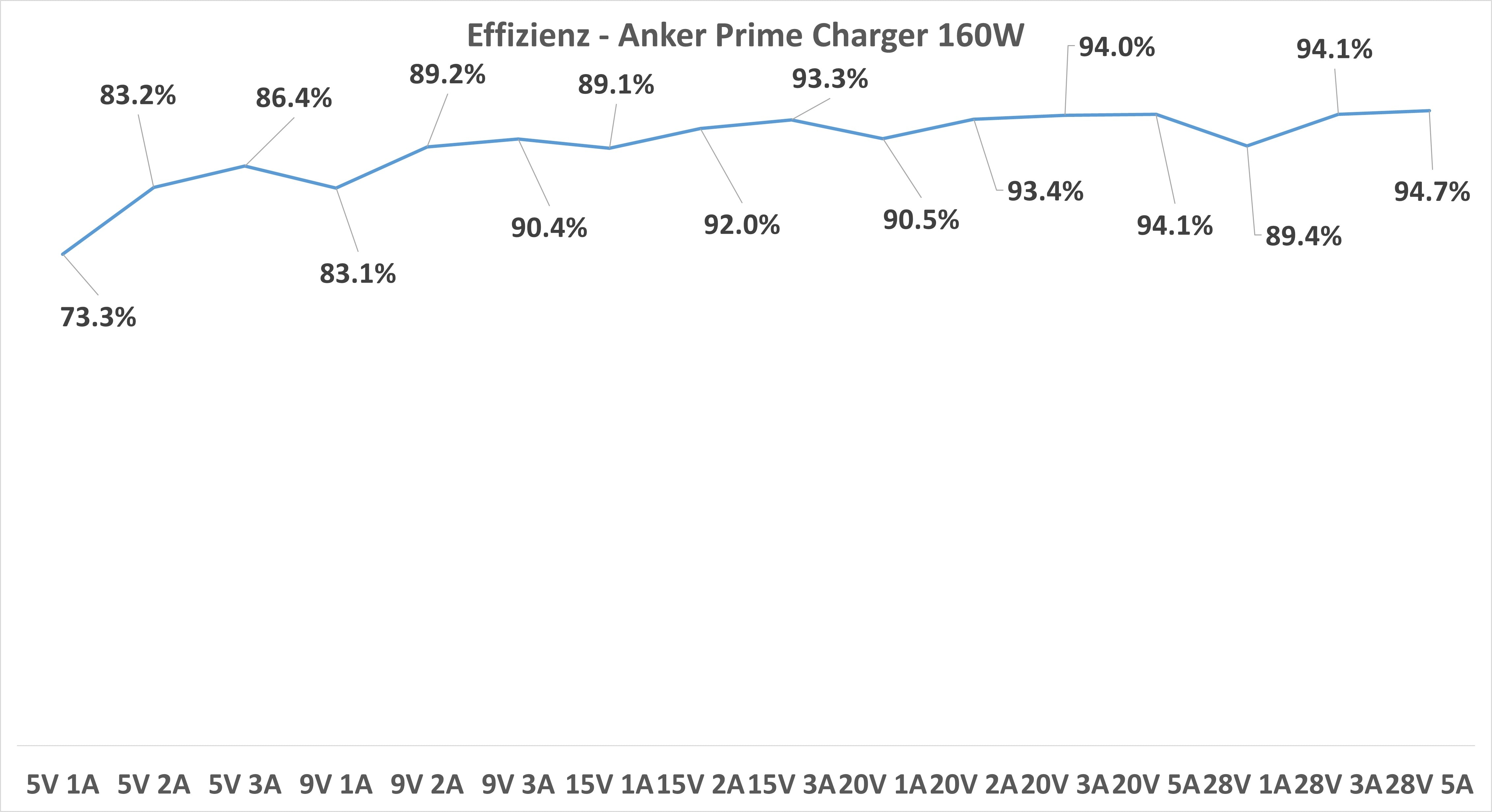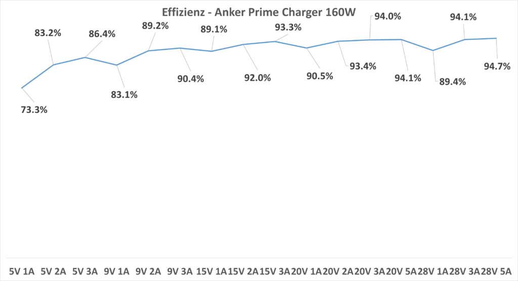 Diese schwankte bei mir im Test zwischen 73,3 % und 94,7 %. Gerade die 94,7 % bei 140 W Last sind absolut herausragend und erklären auch, warum das Ladegerät trotz der kompakten Abmessungen diese Last konstant standhalten konnte.