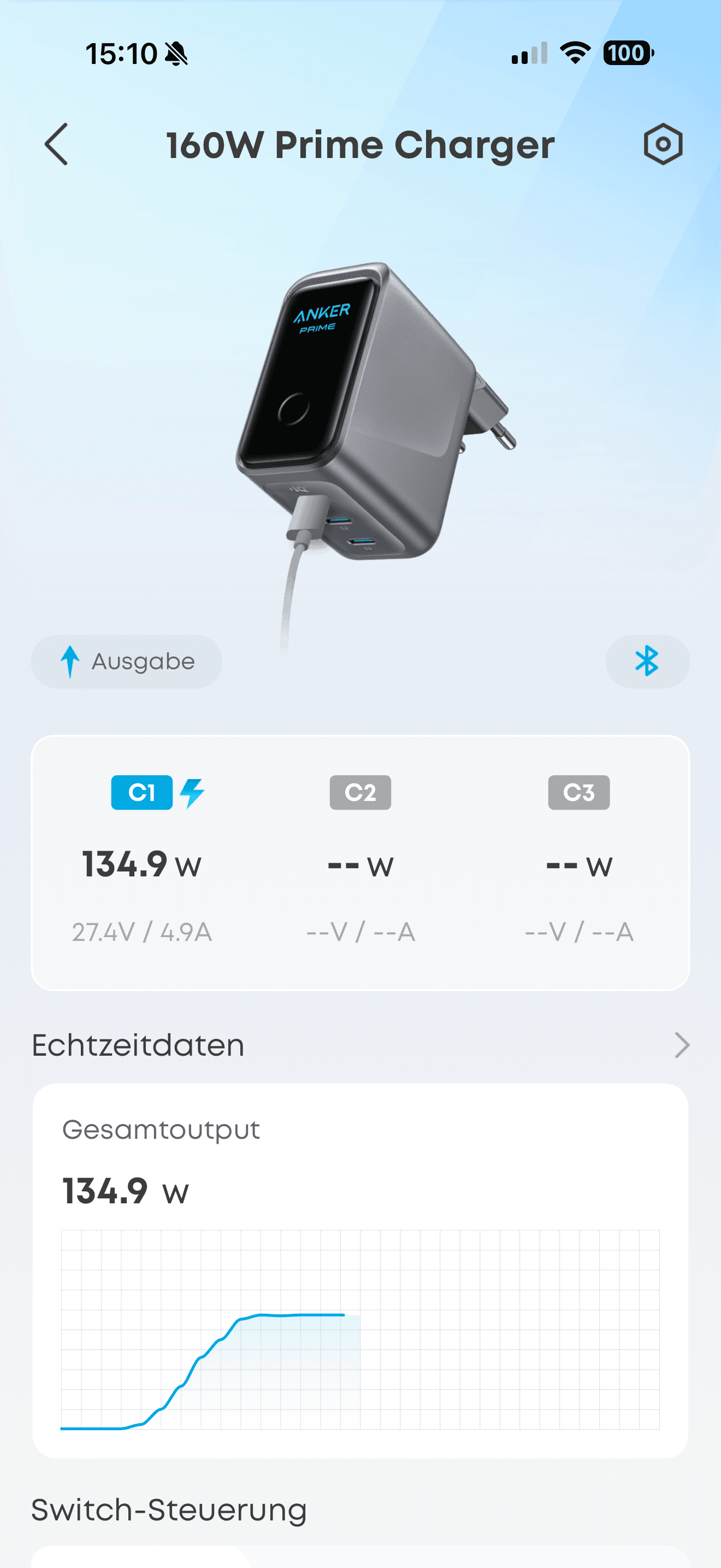 Der Anker Prime Charger 160W hat Bluetooth integriert! Dies erlaubt eine Verbindung zur Anker-App, welche neben weiteren Informationen dir auch das Anpassen einiger Einstellungen ermöglicht.