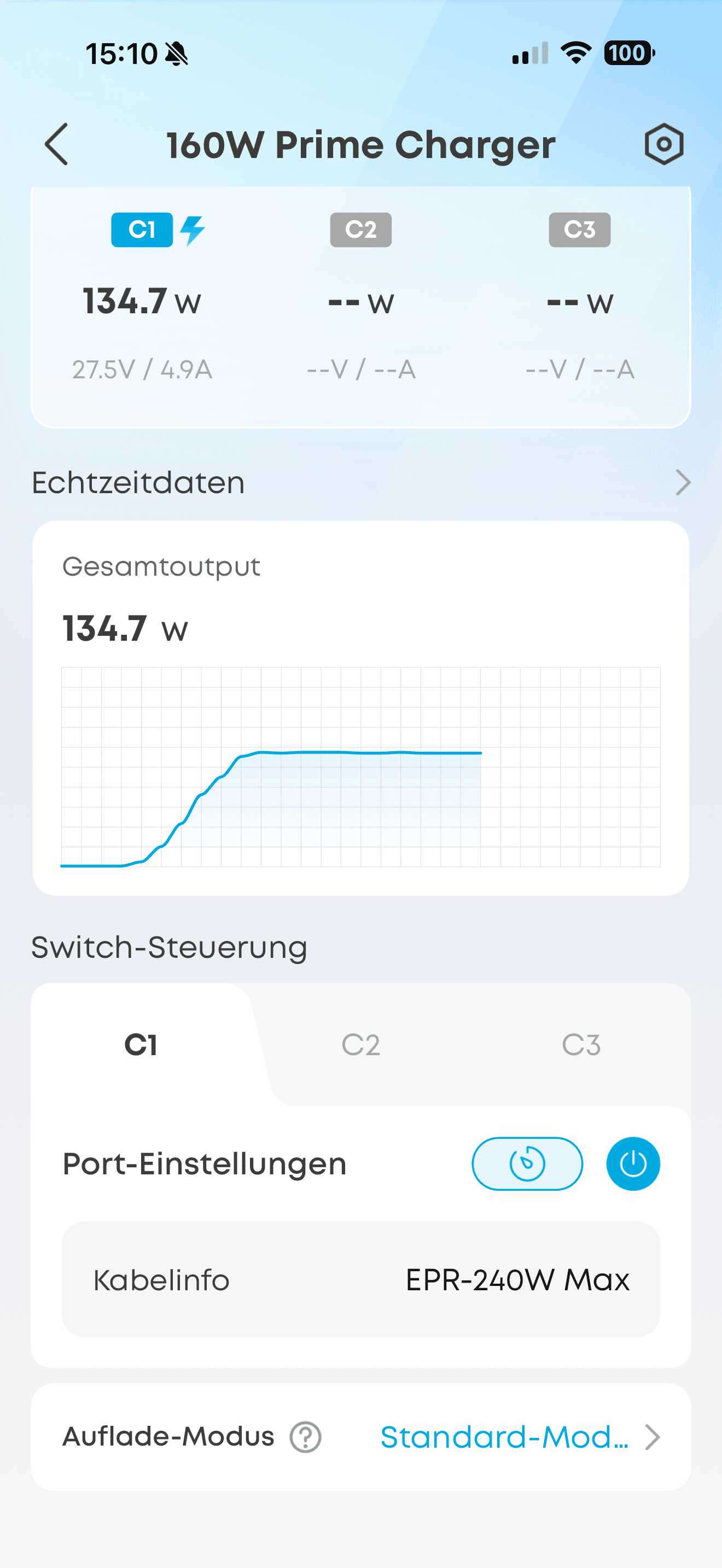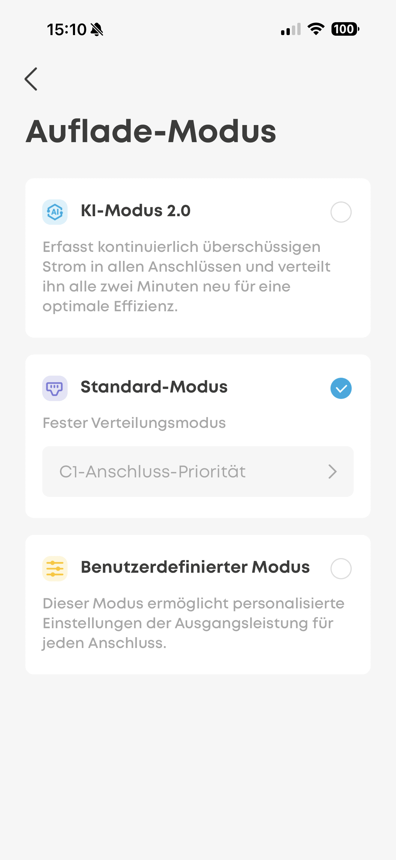 Es gibt hier mehrere Modi. Es gibt z.B. einen „AI“-Modus, bei welchem das Ladegerät versucht, die angeschlossenen Geräte zu erkennen, um dann optimal die Leistung zu verteilen.