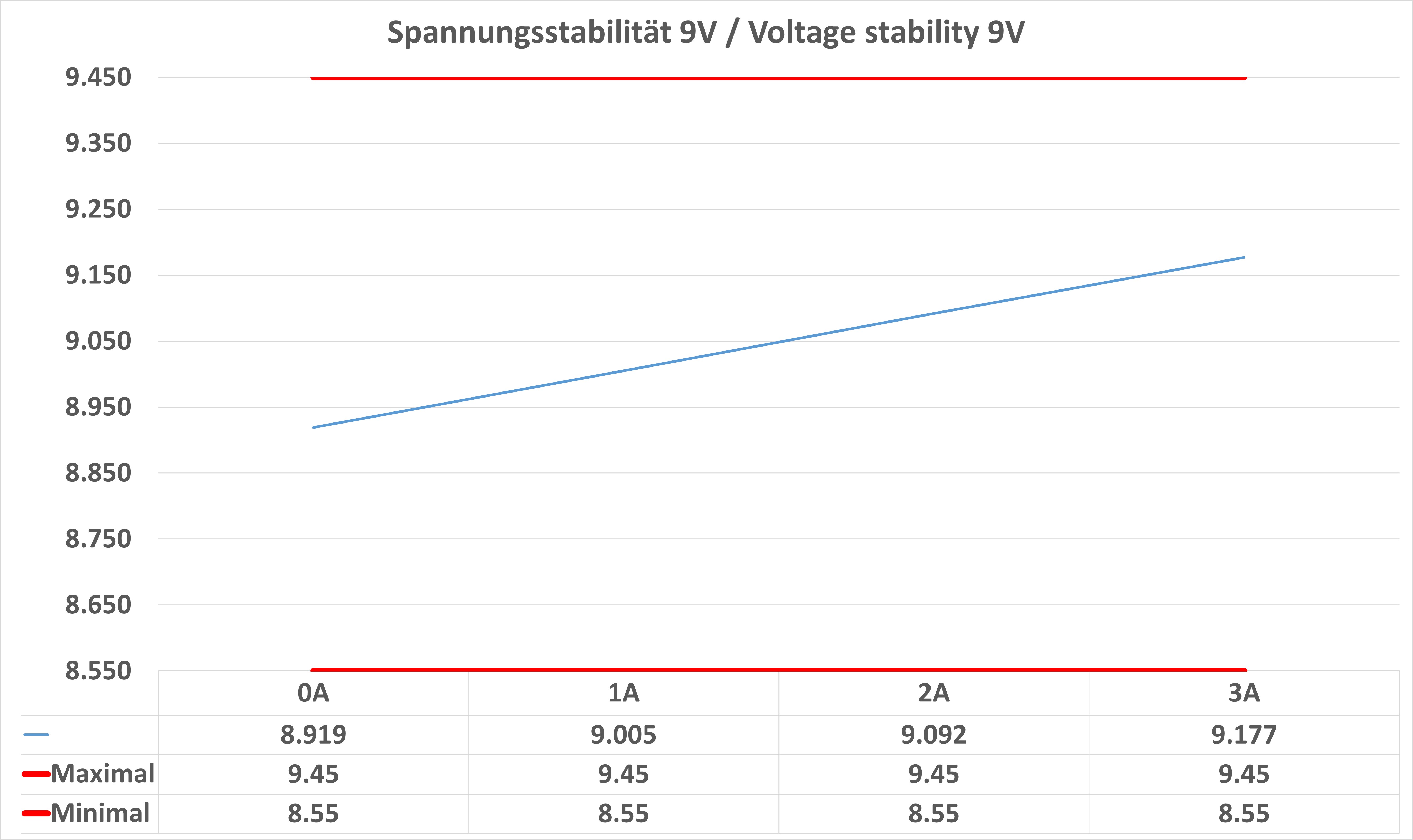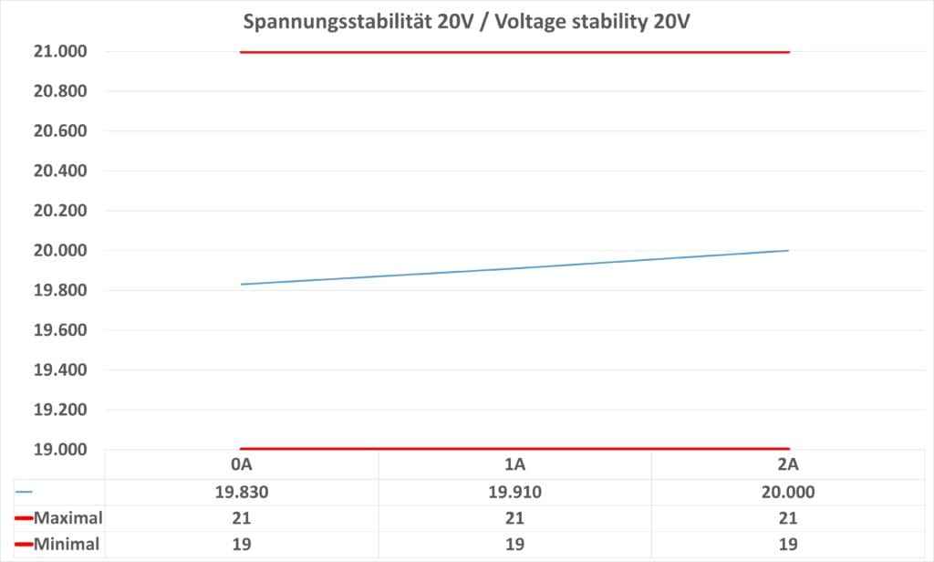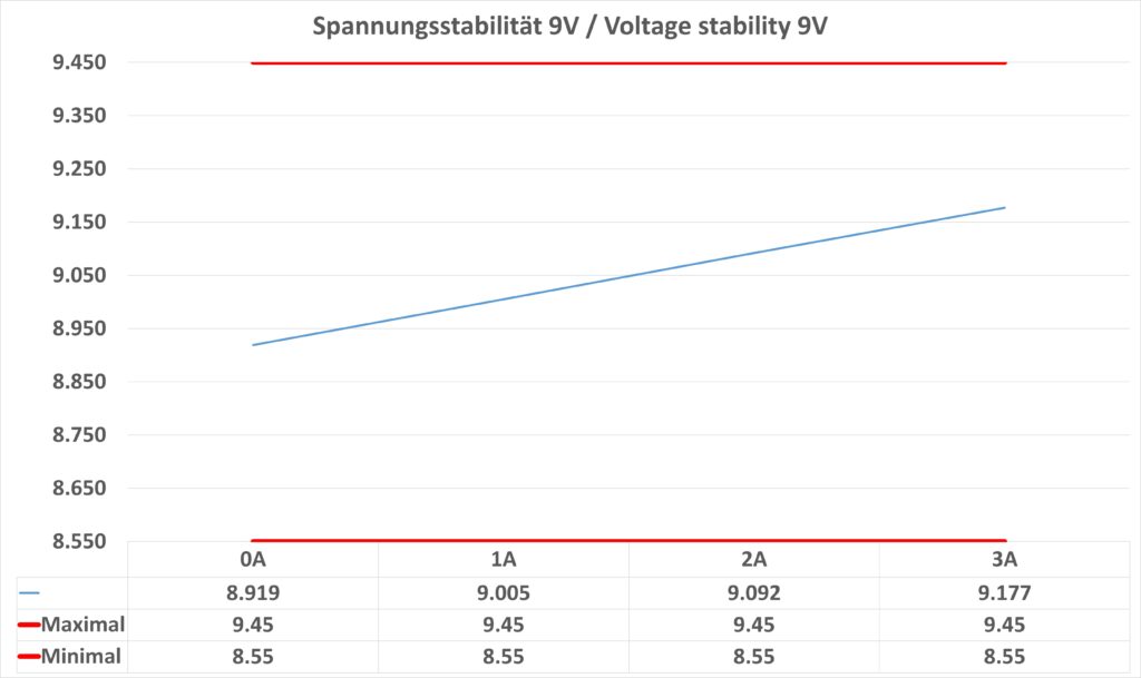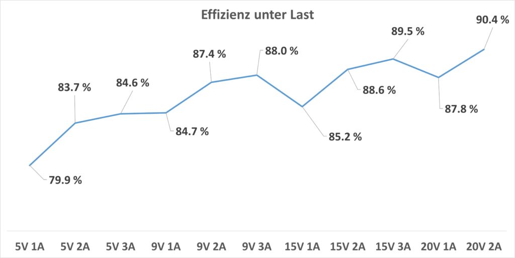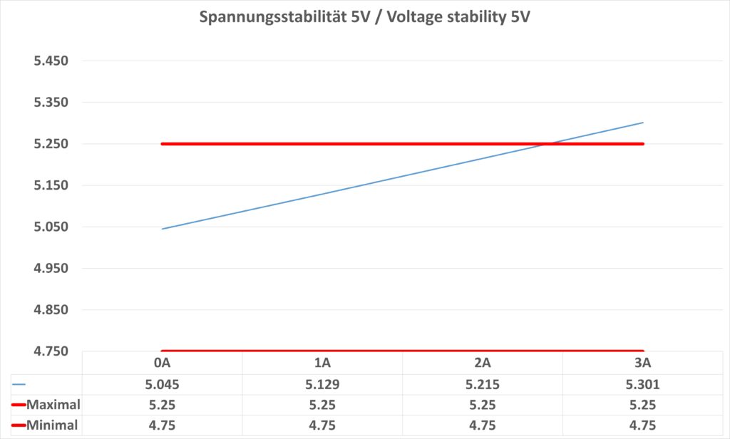 Bei der Spannung sehen wir einen kleinen Ausreißer. Bei der 5 V Stufe unter Volllast überschreitet die Spannung leicht das vom Standard vorgegebene Maximum.