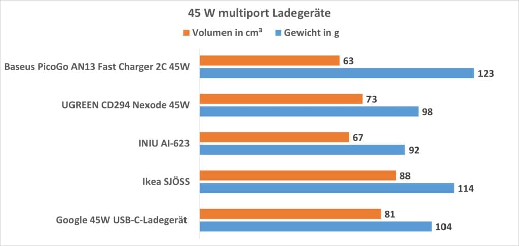 So wiegt das AN13 123 g und misst 49 x 35,7 x 35,8 mm. Vergleichen wir dies einmal mit anderen 45 W Multi-Port Ladegeräten.