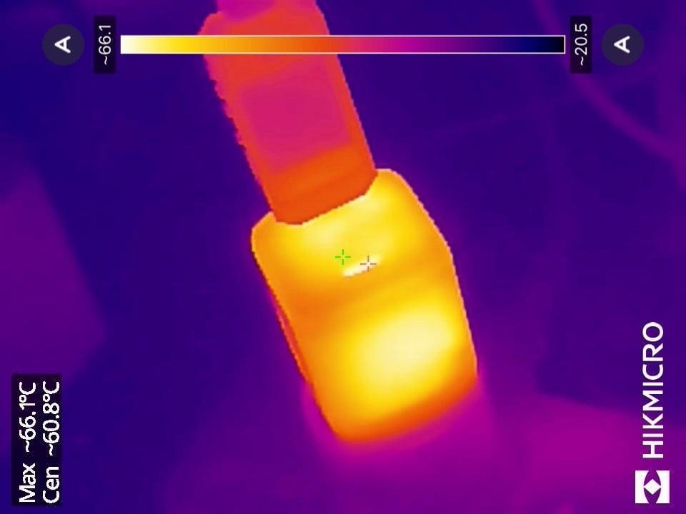 So erreichte dieses keine 70 Grad, was bei konstanter Last erfreulich wenig ist. Aber dies ist auch keine direkte Überraschung, denn ich glaube, wir haben hier ein Ladegerät, das in Wirklichkeit auf 55 W ausgelegt ist.