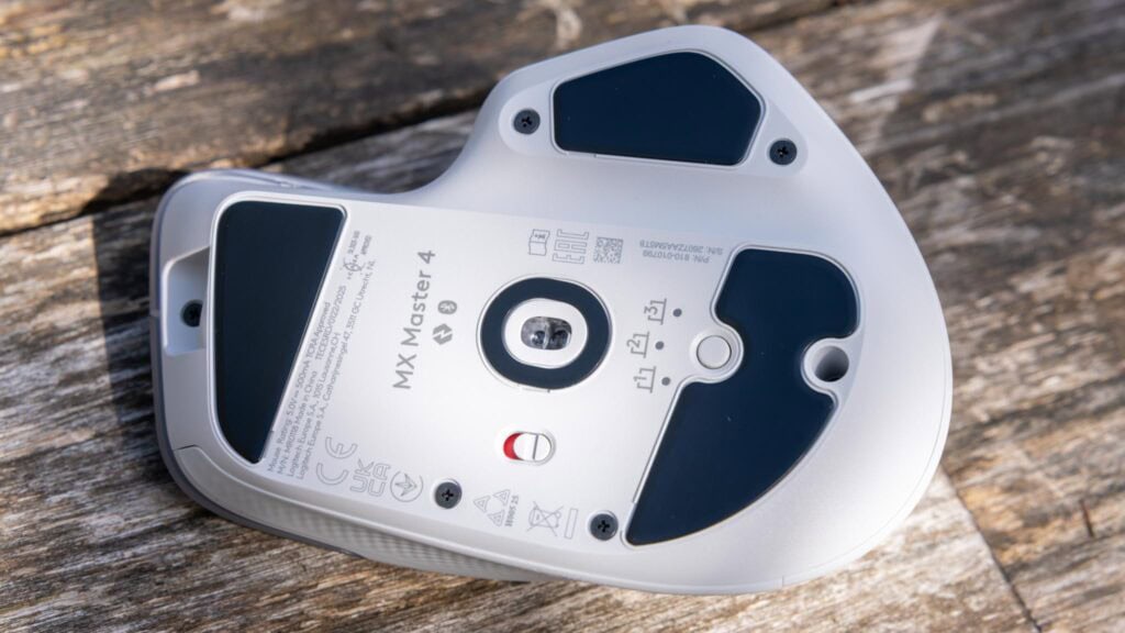 Du kannst die MX Master 4 mit bis zu 3 Geräten via Bluetooth verbinden. Auf der Unterseite der Maus findet sich eine Taste, welche den schnellen Wechsel zwischen den Geräten erlaubt.