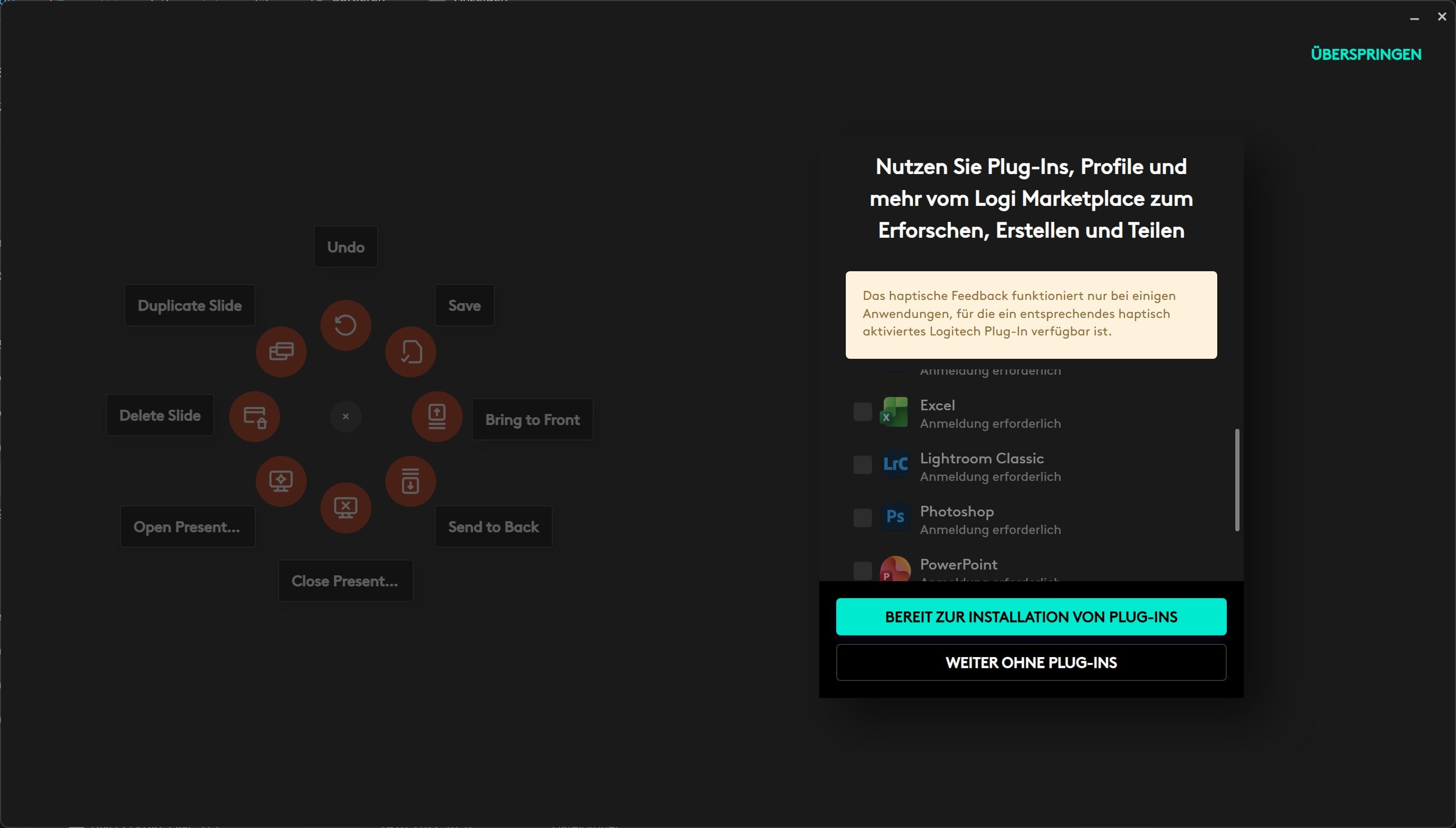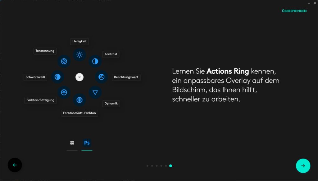 So bietet Logitech für z. B. Photoshop, DaVinci Resolve usw. Plugins an. Hast du dann eine der Anwendungen offen, ändert sich der Inhalt des Menüs.