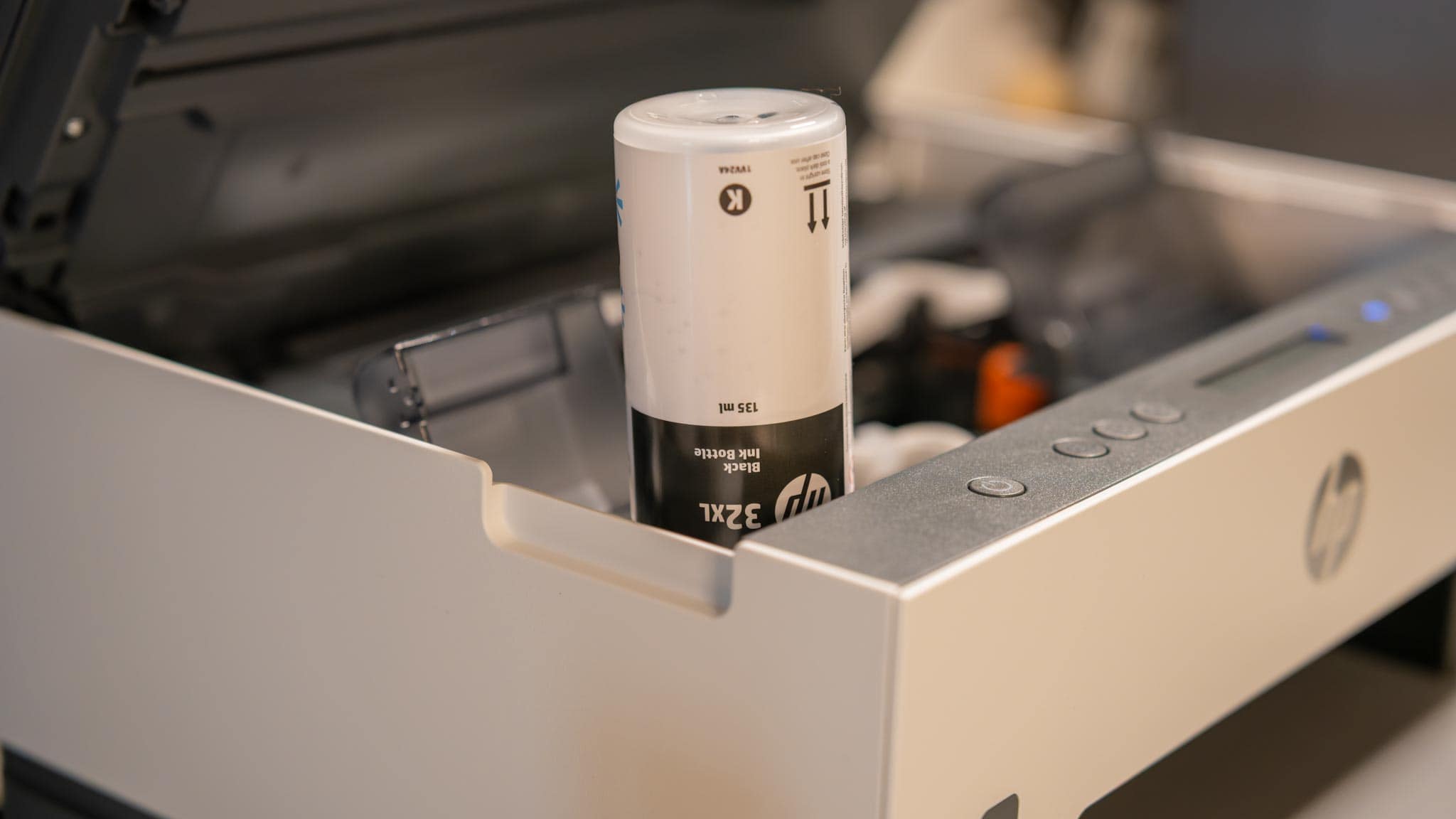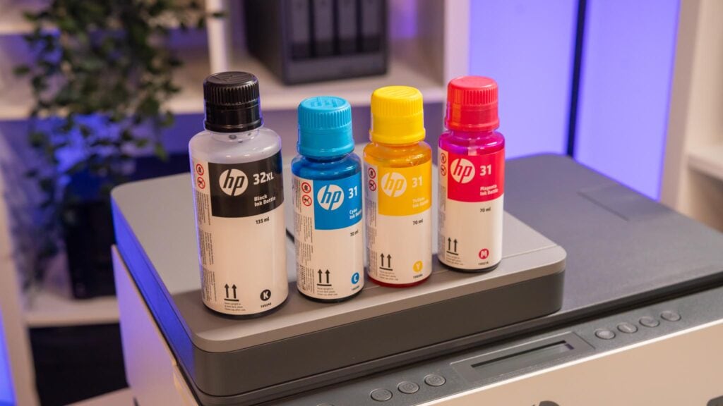 Das Entscheidende ist der Preis der Tinte. Ein originales Set „HP 32XL Black & 31 Cyan Magenta Yellow Ink Bottle Bundle Pack“ kostet rund 60 €.