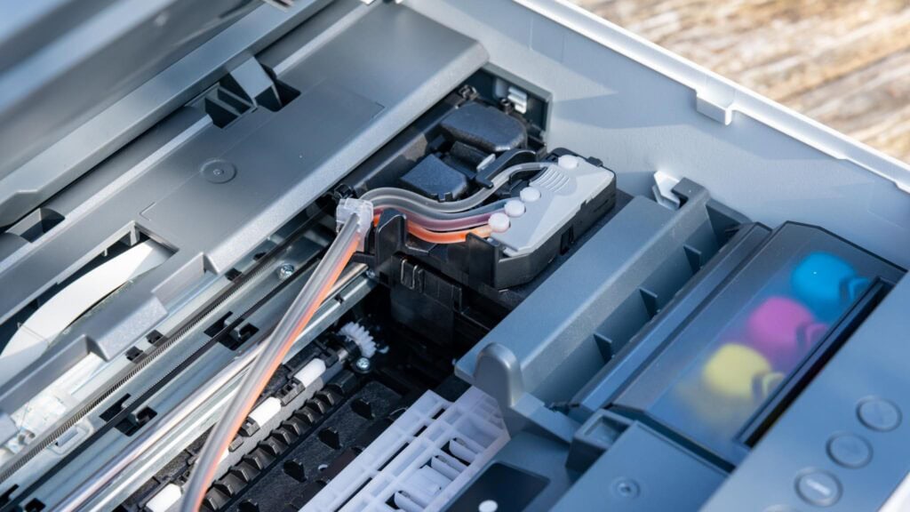 Der wichtige Punkt am HP Smart Tank 7305 ist das Smart-Tank-Design. Wir haben hier also keine Patronen, sondern Tanks im Drucker, welche über Schläuche mit dem Druckkopf verbunden sind.