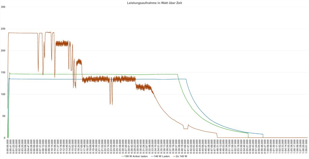 Hier wird es nun etwas wild! Beim Laden mit 2x 140 W können wir sehen, dass die Powerbank wirklich bis zu +- 238 W aufnimmt, was extrem viel ist!