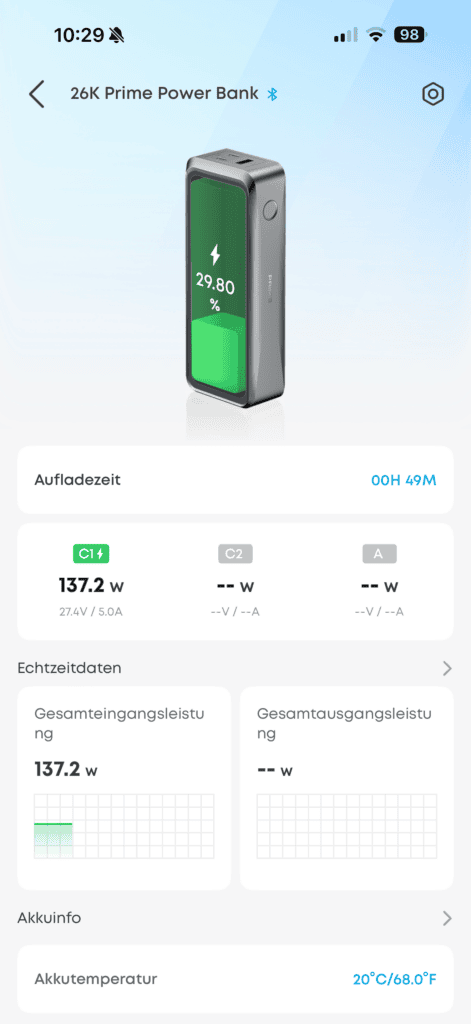 Über die Anker App kannst du zunächst alle Informationen sehen, die auch das Display anzeigt. Dies wäre die aktuelle Leistung, Akkustand usw.