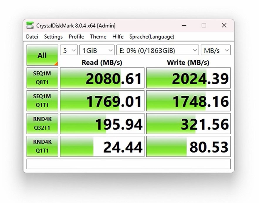 Unter optimalen Bedingungen in CrystalDiskMark erreichte die X10 bei mir beachtliche 2081 MB/s lesend und 2024 MB/s schreibend.