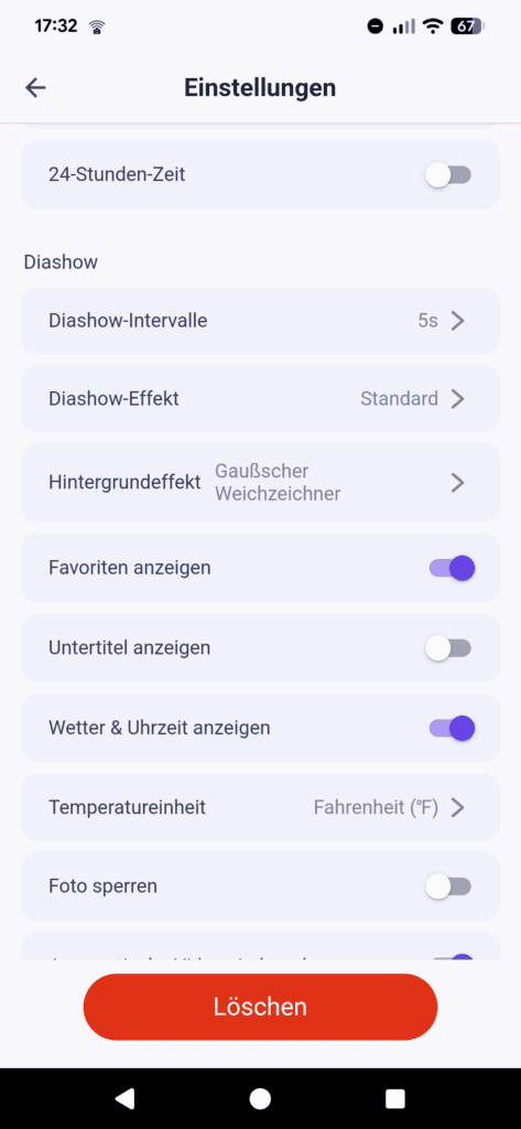 Über die App kannst du die Basis-Einstellungen des Bilderrahmens verwalten, wie z. B. die Übergangszeit für die Bilder, den Diashow-Effekt, Schlafmodus usw.