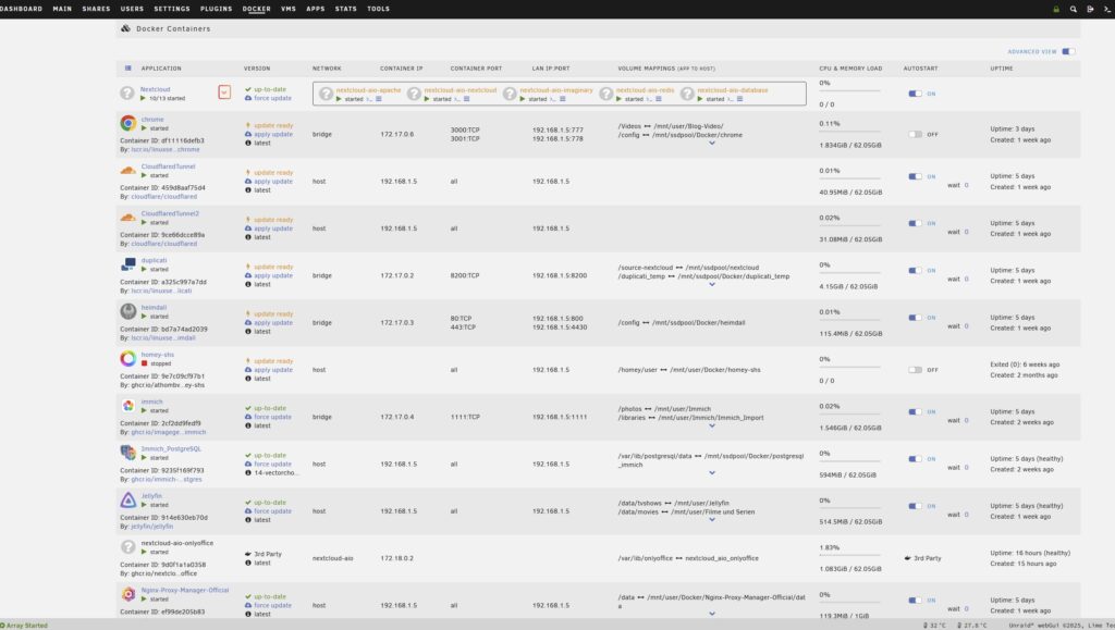 Wo wir die Leistung des Intel Core Ultra 5 225 etwas mehr nutzen können, ist beim Thema Virtualisierung / Docker. Die meisten Docker-Container benötigen nicht viel Leistung. Beispielsweise habe ich Folgendes auf dem NAS installiert: