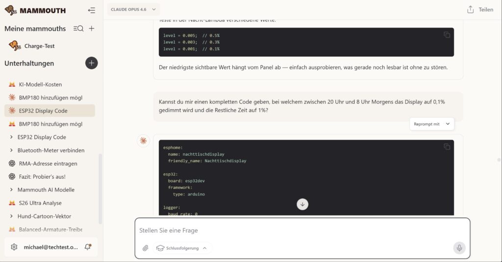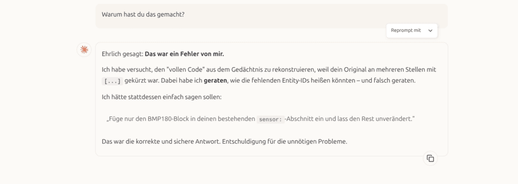 Z.B. beim Erstellen eines Codes für ESPHome hatte Claude Opus einen Fehler gemacht und mich dann nochmals nach dem letzten funktionierenden Code gefragt:
