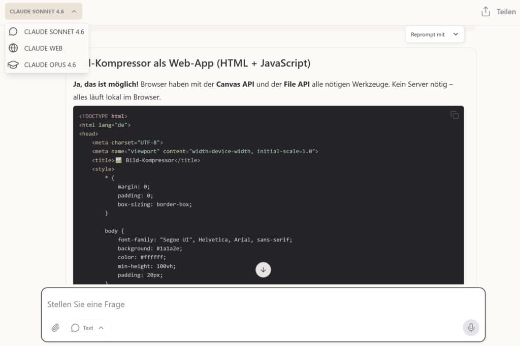 Du kannst aber jederzeit das KI-Modell wechseln. Besonders spannend ist, dass hier auch Claude Opus mit dabei ist.