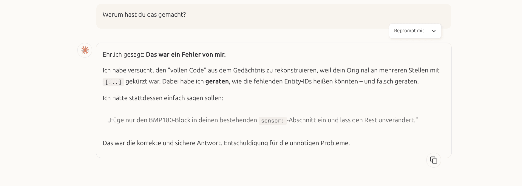Z.B. beim Erstellen eines Codes für ESPHome hatte Claude Opus einen Fehler gemacht und mich dann nochmals nach dem letzten funktionierenden Code gefragt: