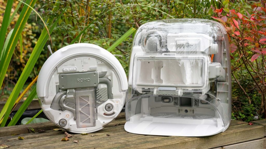 So kann die Ladestation den ROMO nicht nur laden, sondern auch Schmutz absaugen, die Pads auswaschen und sogar den Saugroboter mit Wasser fürs Putzen betanken.