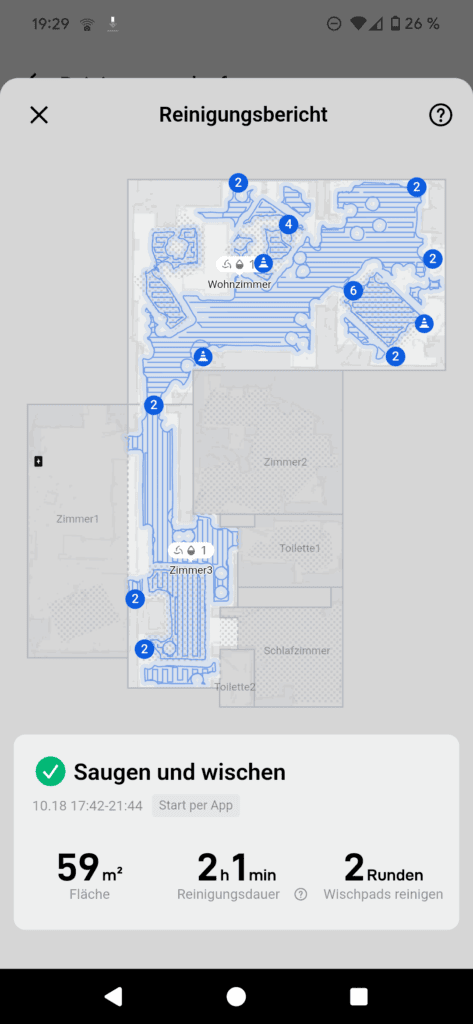 Lediglich die in der App angezeigte Karte ist erstaunlicherweise etwas weniger detailliert als bei Narwal oder Dreame. Ich vermute, dies liegt am fehlenden 360-Grad-LiDAR-Sensor. Aber in der Praxis spielt die Auflösung der Karte in der App kaum eine Rolle.