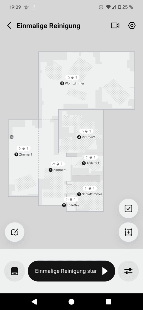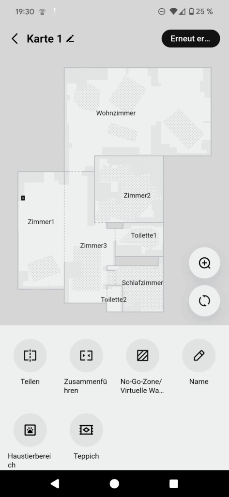 Wählst du deinen Sauger aus, landest du auf der Startseite, wo die Karte deiner Wohnung angezeigt wird. Diese Karte wird automatisch in verschiedene Räume unterteilt. Diese Unterteilung kannst du auf Wunsch auch noch anpassen, also Räume teilen oder zusammenführen. Macht auch Sinn, denn zumindest bei meiner frühen Software-Version war die automatische Raumunterteilung nicht perfekt.