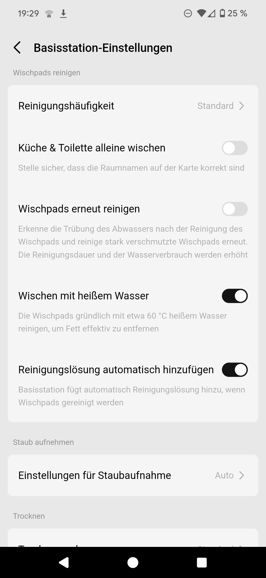 Ansonsten lassen sich in der App natürlich auch No-Go-Zonen festlegen, die Saug- und Putzleistung einstellen, wie auch einige Anpassungen bei der Ladestation vornehmen.