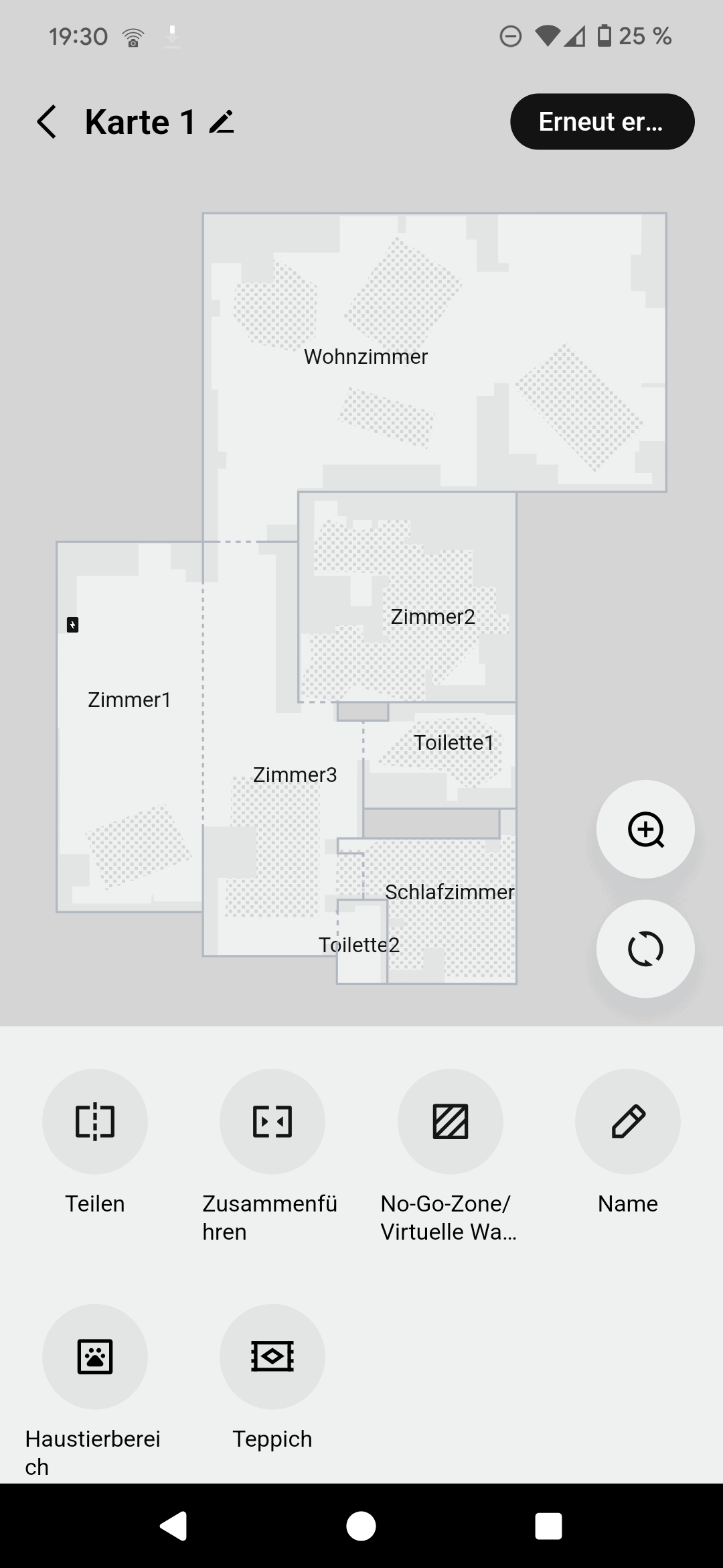 Wählst du deinen Sauger aus, landest du auf der Startseite, wo die Karte deiner Wohnung angezeigt wird. Diese Karte wird automatisch in verschiedene Räume unterteilt. Diese Unterteilung kannst du auf Wunsch auch noch anpassen, also Räume teilen oder zusammenführen. Macht auch Sinn, denn zumindest bei meiner frühen Software-Version war die automatische Raumunterteilung nicht perfekt.