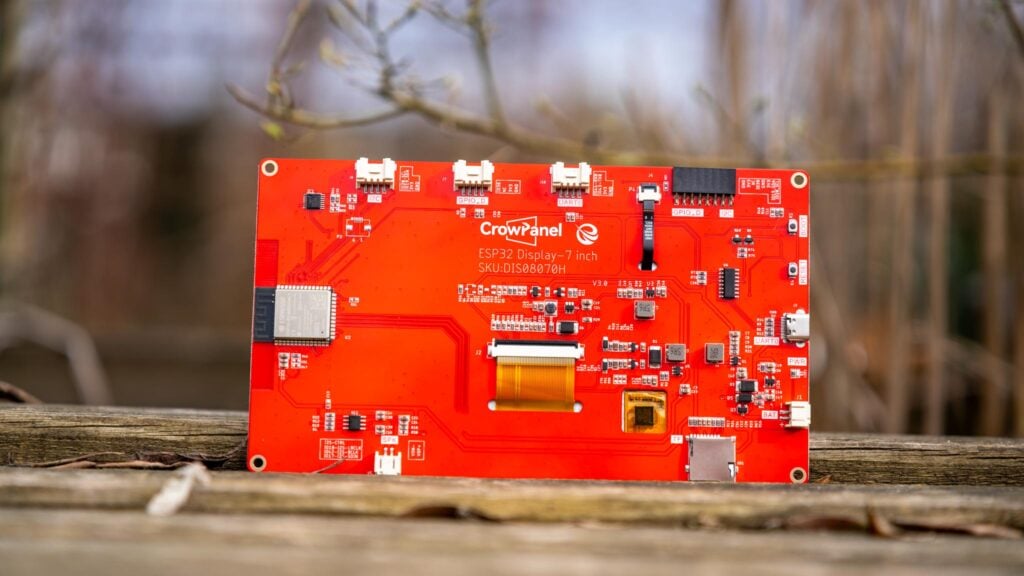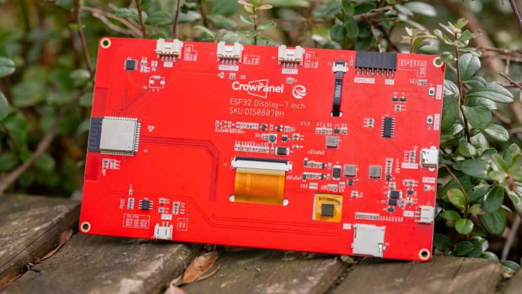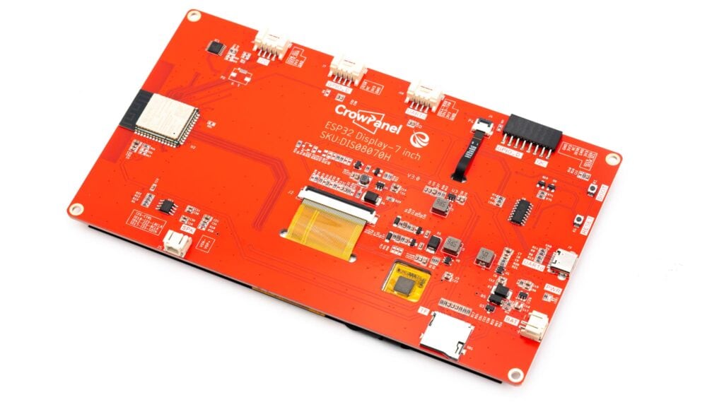 Du bekommst mit dem ELECROW CrowPanel Basic ein „nacktes“ Modul ohne Gehäuse. So ist dieses ein rotes PCB mit vormontiertem ESP32, diversen Headern und dem 7-Zoll-Touchscreen auf der Front.