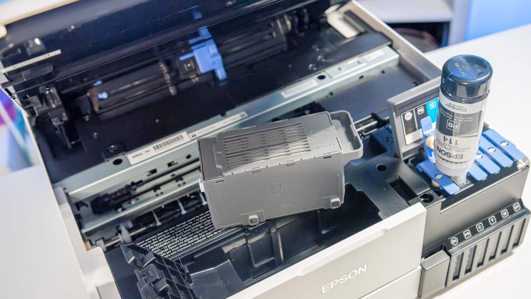 Beim ET-8500 gibt es hingegen eine Box, die du selbst tauschen kannst. Sollte also hier der Resttintenbehälter voll sein: Kein Problem, kannst du tauschen.