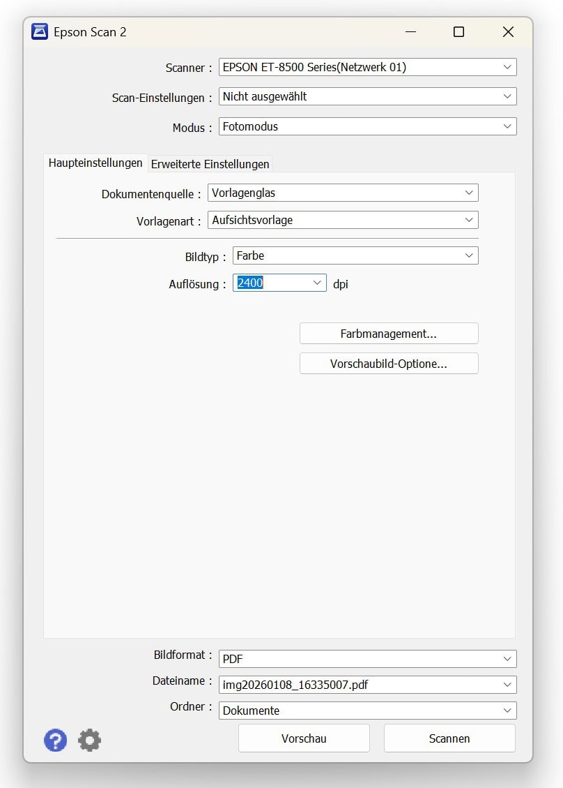Wichtig! Du willst die Epson-Scan-2-Anwendung nutzen und nicht die Windows-eigene Scan-Anwendung. Letztere liefert eine deutlich schlechtere Qualität.
