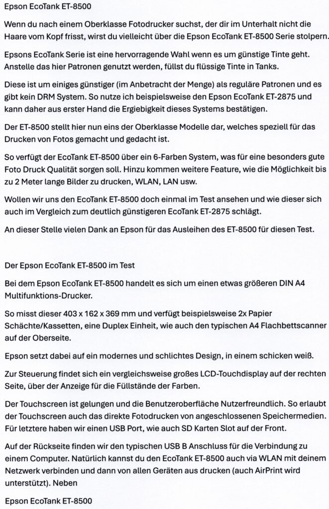 Darüber, dass der ET-8500 sauber Briefe auf normalem Papier drucken kann, brauchen wir nicht sprechen. Das schaffen auch günstige Modelle tadellos.