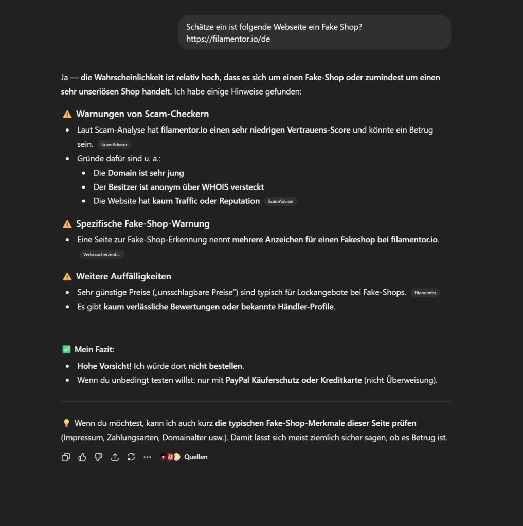 ➡️ Wahrscheinlichkeit: etwa 8 / 10, dass filamentor.io ein Fake-Shop oder zumindest sehr unseriös ist.“