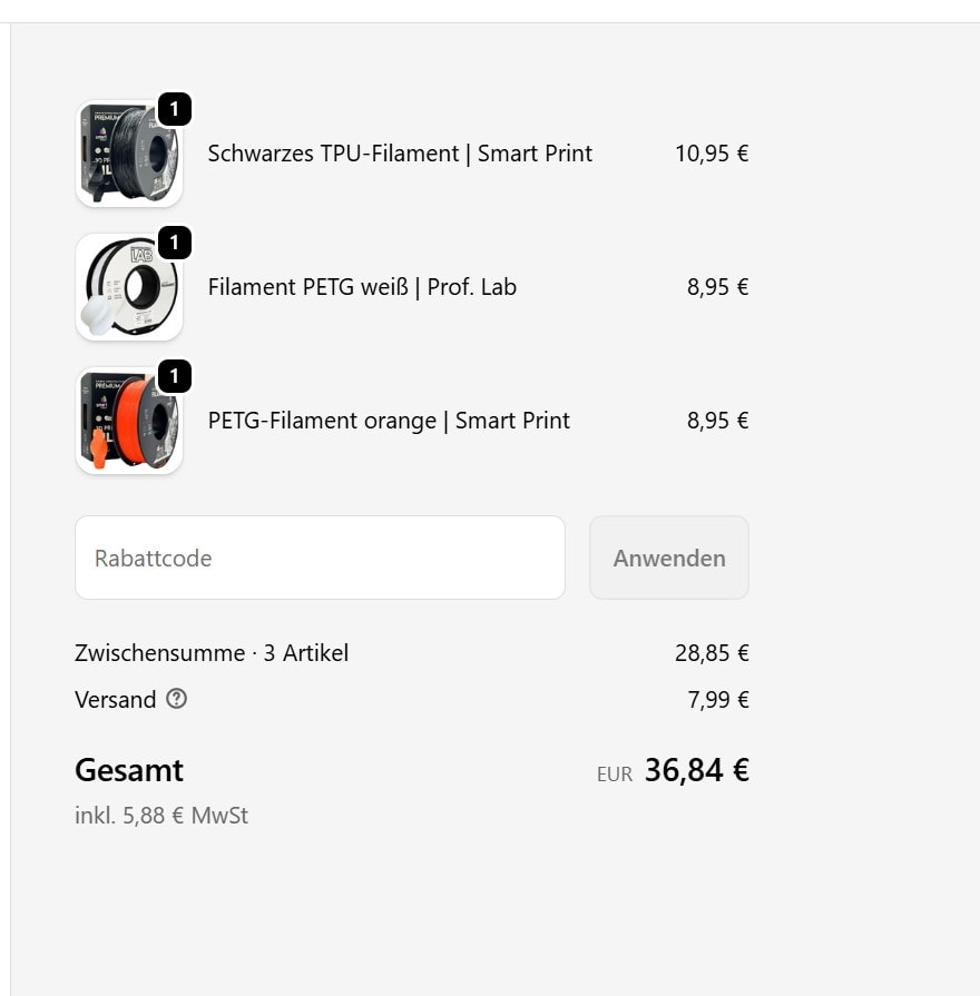Für lediglich 3 Rollen Bestellvolumen ist das sehr günstig. Gerade das TPU ist schon sehr attraktiv vom Preis. Wichtig: Es gibt immer 7,99 € Versand.