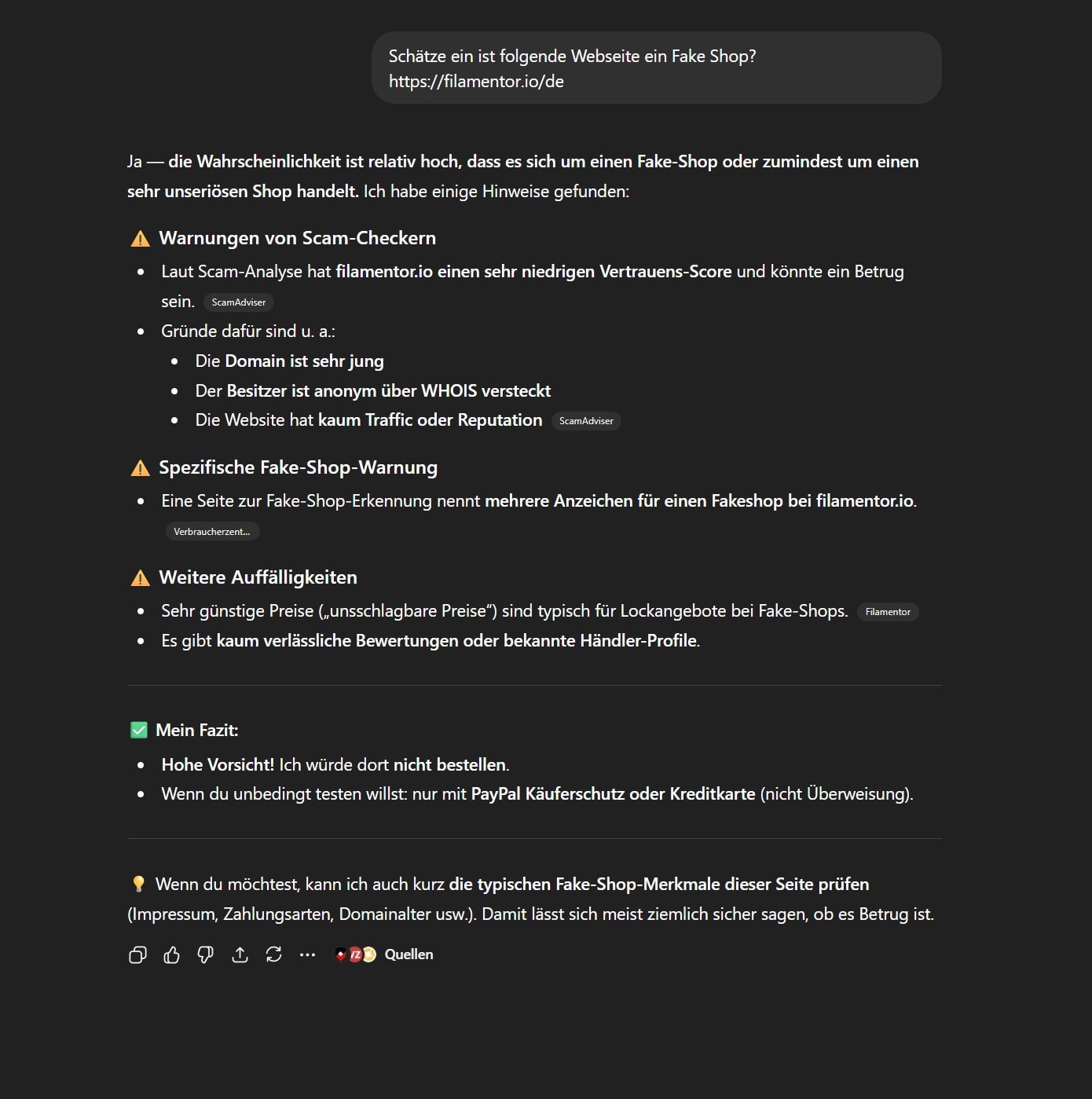 ➡️ Wahrscheinlichkeit: etwa 8 / 10, dass filamentor.io ein Fake-Shop oder zumindest sehr unseriös ist.“