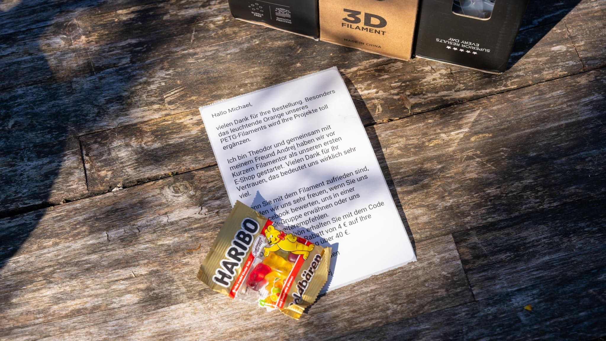 Mit im Lieferumfang befand sich ein kleiner Dankeszettel mit Gutschein für die nächste Bestellung (4 € Rabatt, 40 € Mindestbestellwert) und eine Mini-Tüte Gummibären. Kurzum: Top! Keine Beschwerden.