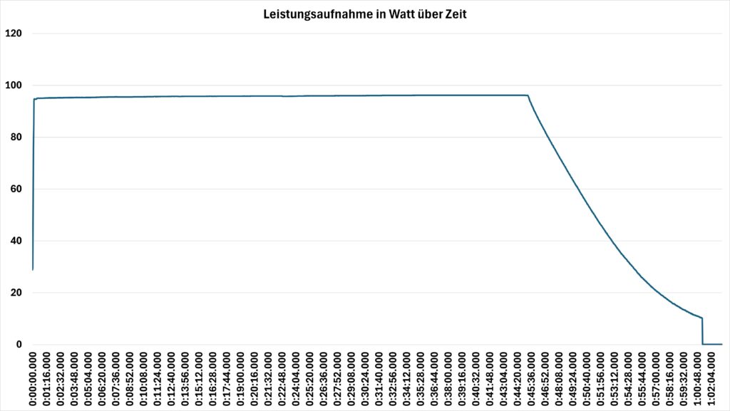 Allerdings kann die Powerbank recht konstant mit 95,x W laden, was in einer Ladezeit von lediglich 1:01 h resultiert.
