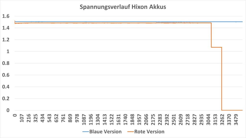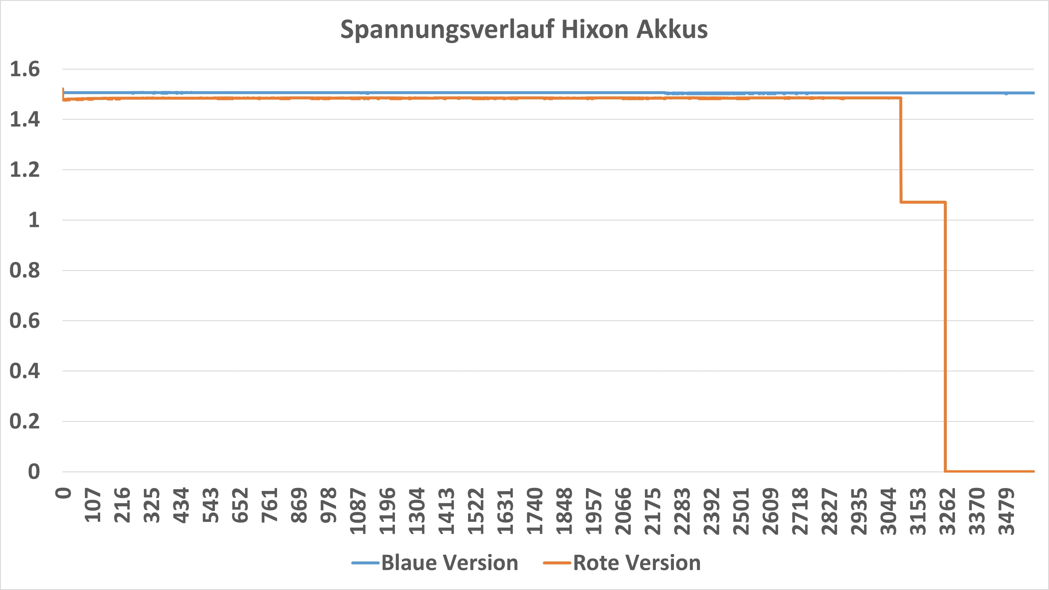 • Die roten Hixon Akkus drosseln die Spannung kurz vor Ende auf 1,1 V herunter. Ansonsten ist diese auch konstant.