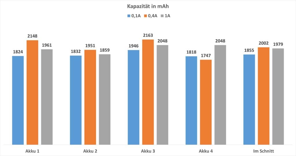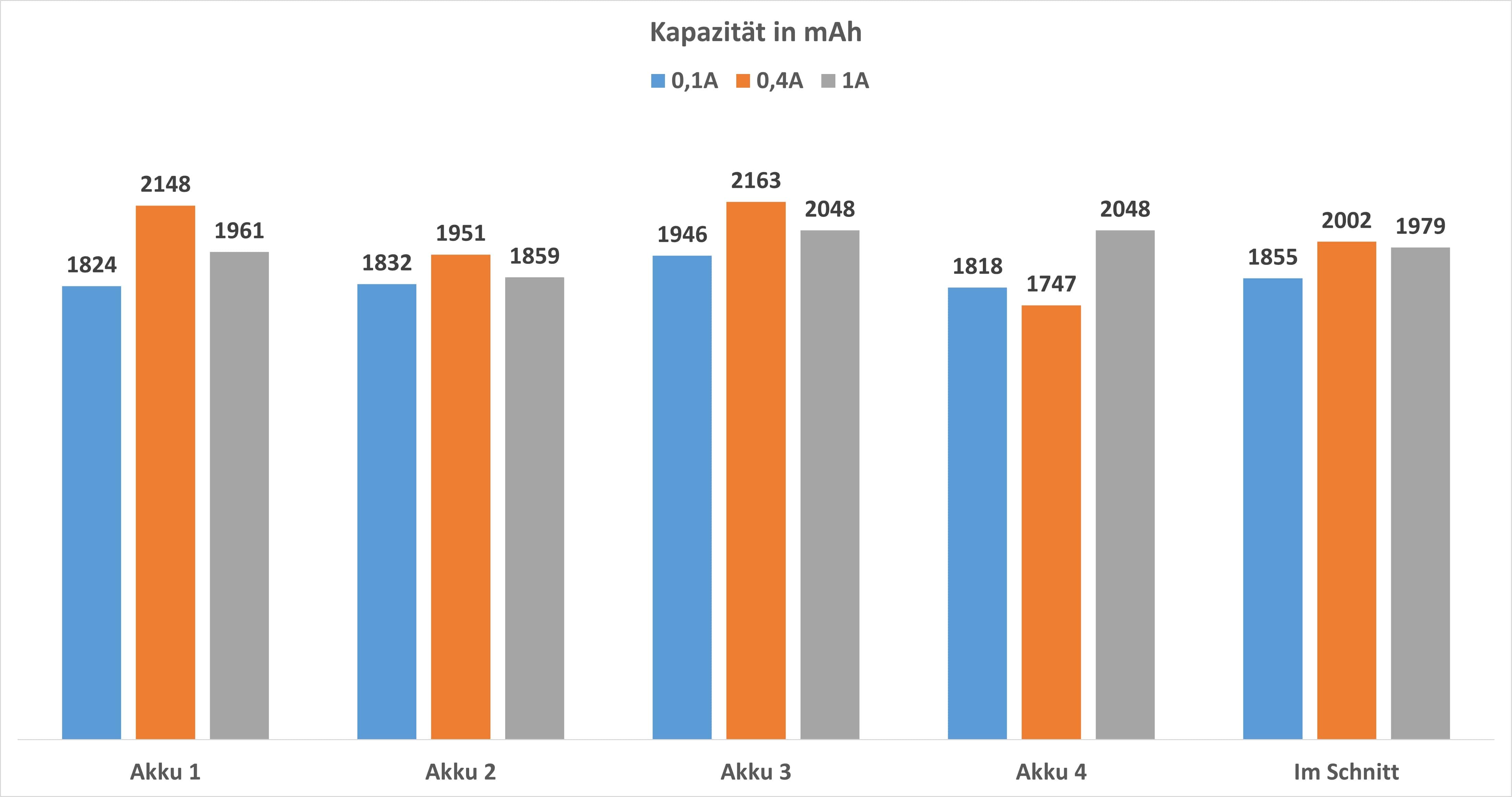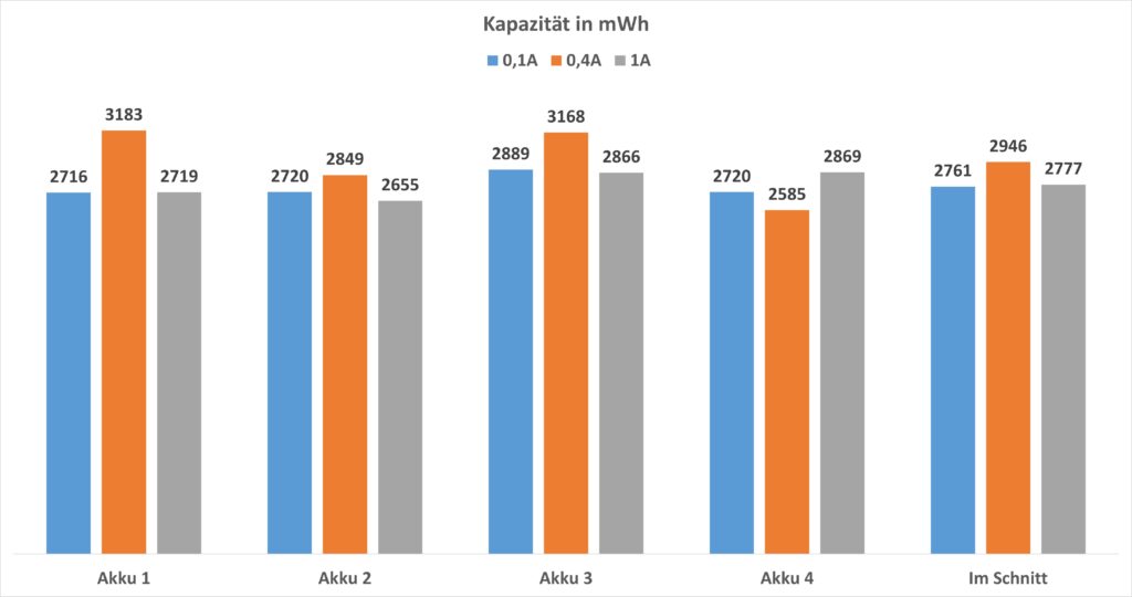 Ich habe die Kapazität der Akkus bei 3 Laststufen (0,1 A, 0,4 A, 1 A) gemessen. Zudem habe ich 4 Akkus aus dem bestellten Set getestet. Dies bildet die echte Kapazität und Serienschwankungen etwas besser ab.