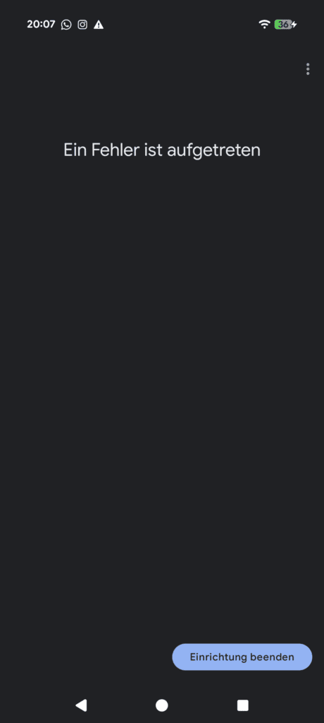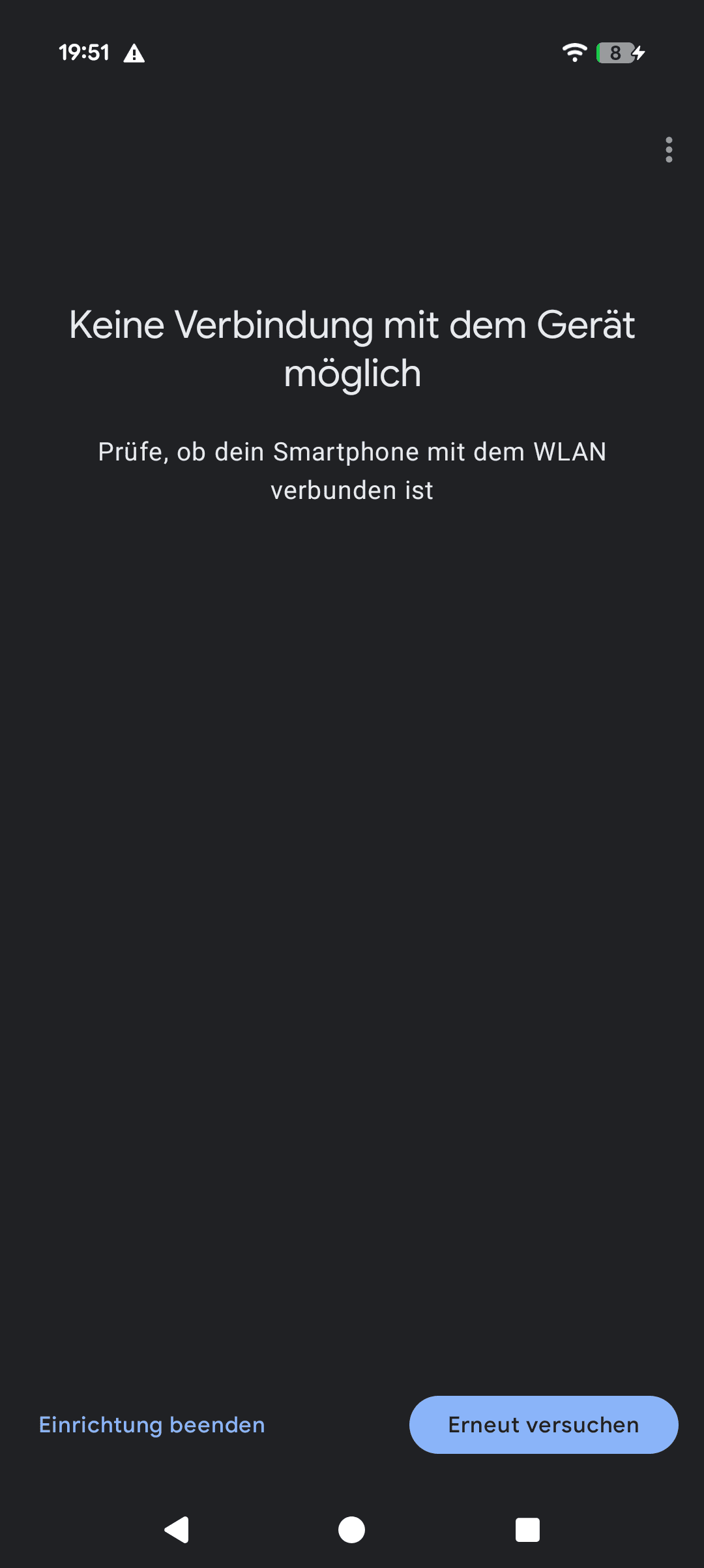 Bei meinem Google Pixel 10 Pro gab es bei den ersten drei Versuchen eine Fehlermeldung, dass keine Verbindung hergestellt wurde. Bei Versuch 4 kam eine Fehlermeldung, dass angeblich das Pixel die Verbindung zum WLAN verloren hätte (was nicht der Fall war). Versuch 5 brachte die Meldung „Ein Fehler ist aufgetreten“. Nach einigen weiteren Versuchen funktionierte es dann irgendwann.