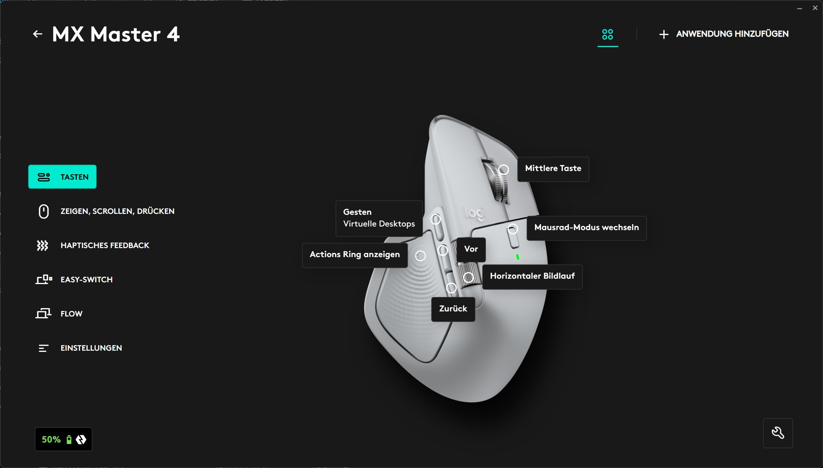 Logitech bewirbt die Akkulaufzeit der MX Master 4 mit „bis zu 70 Tagen“. Leider ist hier nicht klar zu entnehmen, wie lange die Nutzung pro Tag ist. Aus persönlicher Erfahrung kann ich sagen, dass es nicht 70 × 24 h sind. Vermutlich rechnet Logitech mit 8 Arbeitsstunden pro Tag oder Ähnlichem.