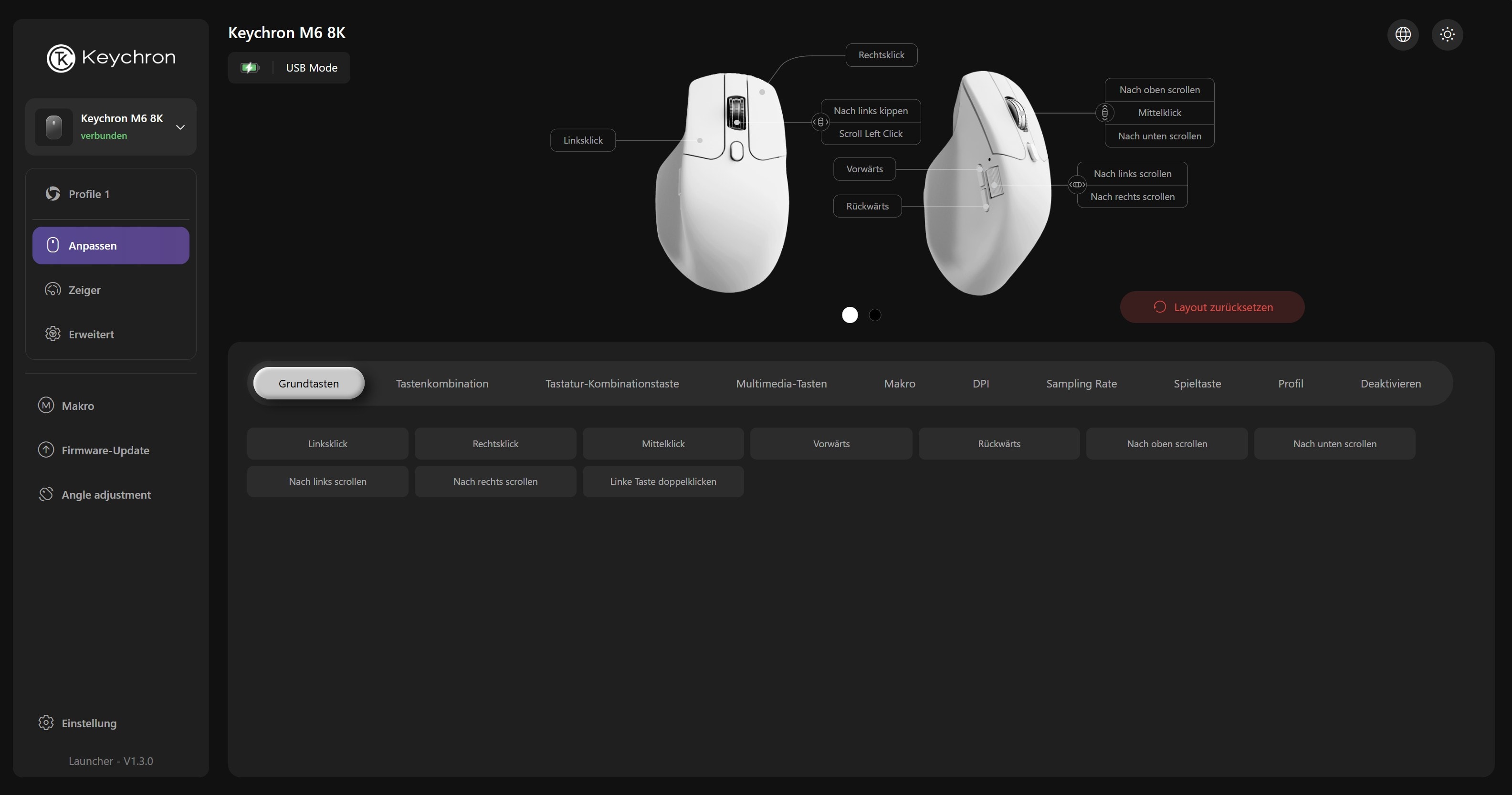 Keychron wiederum bietet keine Desktop-Software an. Stattdessen gehst du auf die Webseite https://launcher.keychron.com/ – dort hast du eine WebUI, welche dir die Konfiguration deiner Maus erlaubt. Keine Registrierung erforderlich, keine Software, die Ressourcen frisst, und grundsätzlich unter jedem Betriebssystem verfügbar. Dabei lassen sich hier auch erweiterte Funktionen anlegen, wie Makros usw., die sich auf der Maus speichern lassen. Ebenso gibt es erweiterte Einstellungen wie Lift-off Distance usw.