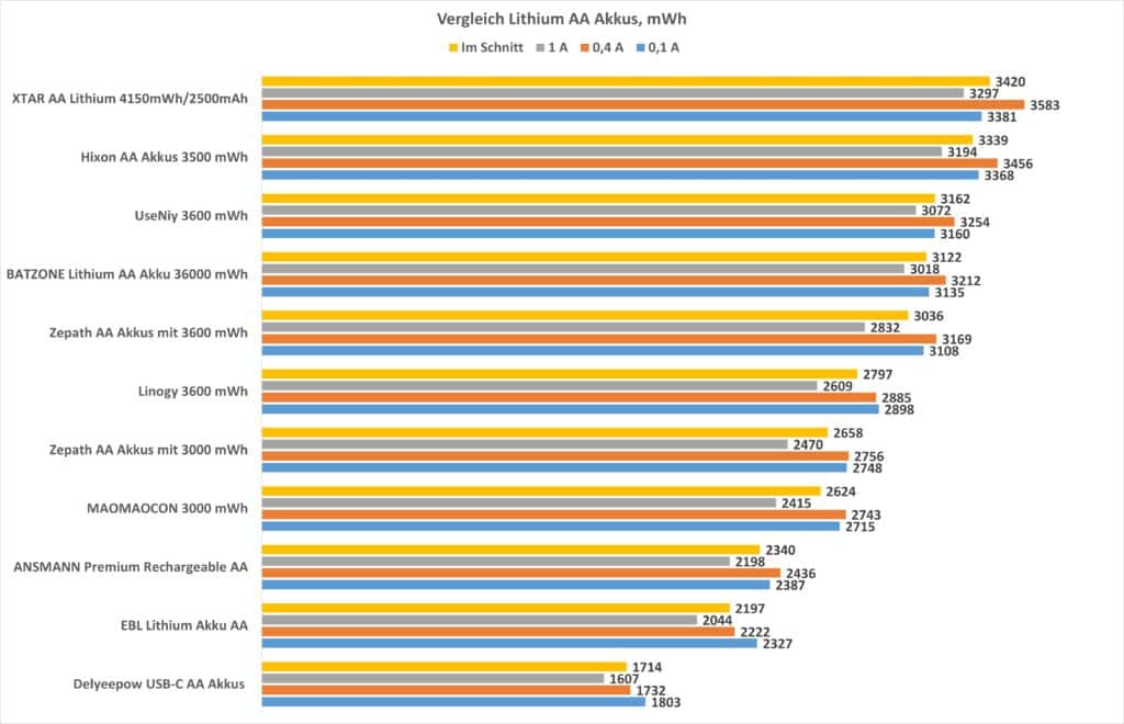 Vergleichen wir dies mit anderen Lithium-AA-Akkus, sehen wir ein +- vergleichbares Abschneiden zu anderen Modellen, die mit 3600 mWh werben.