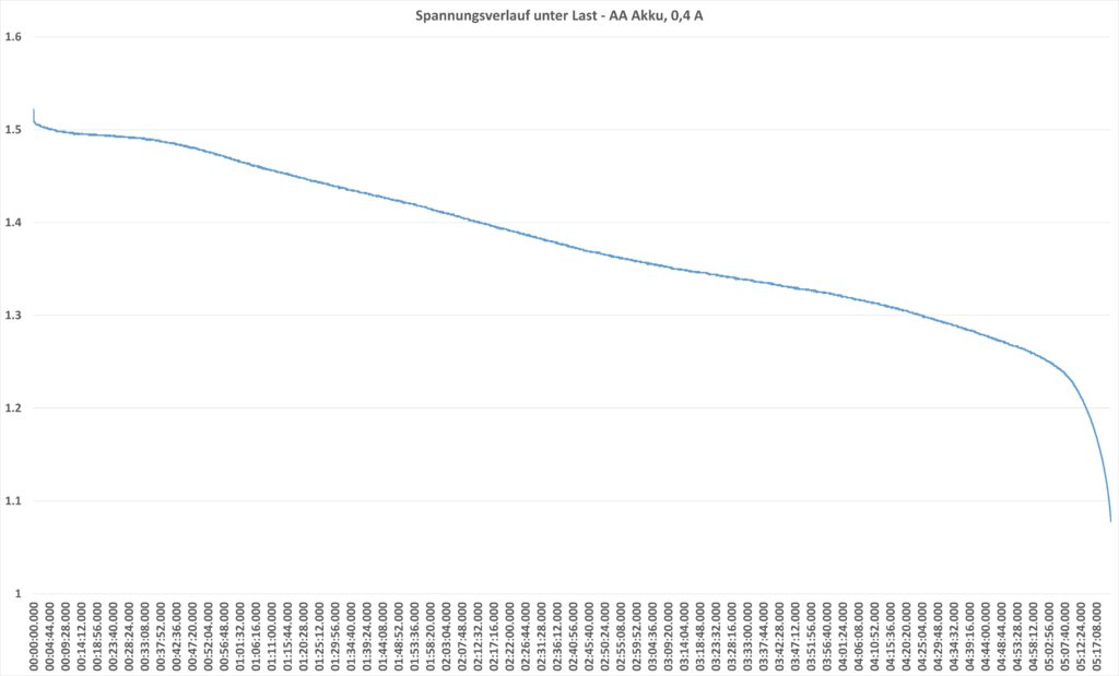 Bei ca. 1,1 V ist dann Schluss und die Akkus kappen die Ausgangsspannung. Damit kopieren diese den Spannungsverlauf von normalen AA-Batterien.
