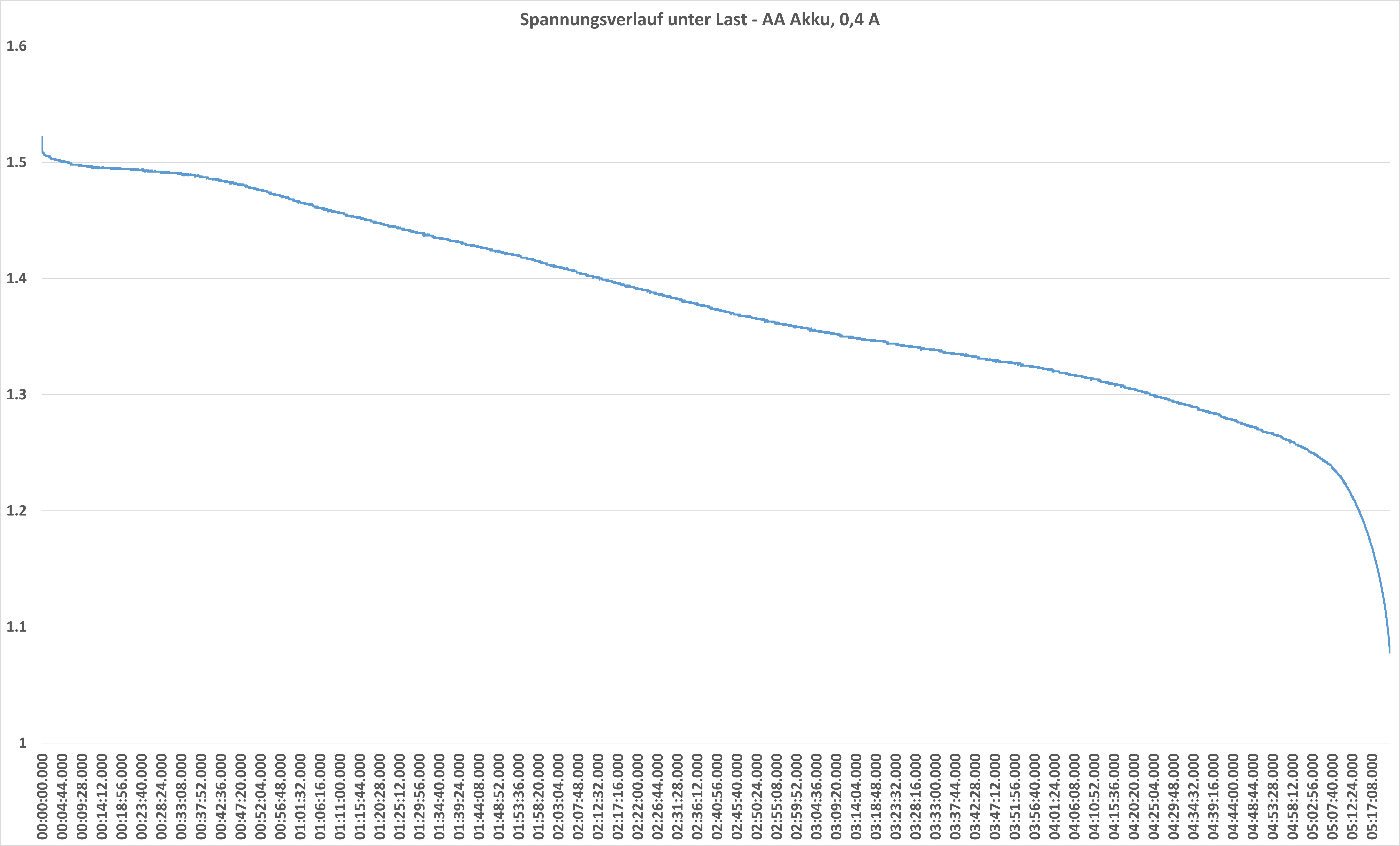 Bei ca. 1,1 V ist dann Schluss und die Akkus kappen die Ausgangsspannung. Damit kopieren diese den Spannungsverlauf von normalen AA-Batterien.