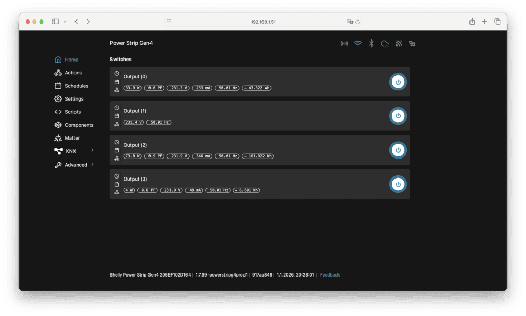 Sowohl in der WebUI wie auch in der Shelly App werden die einzelnen Steckdosen des Power Strip 4 Gen4 mehr oder weniger als individuelle Geräte erkannt und gesteuert.